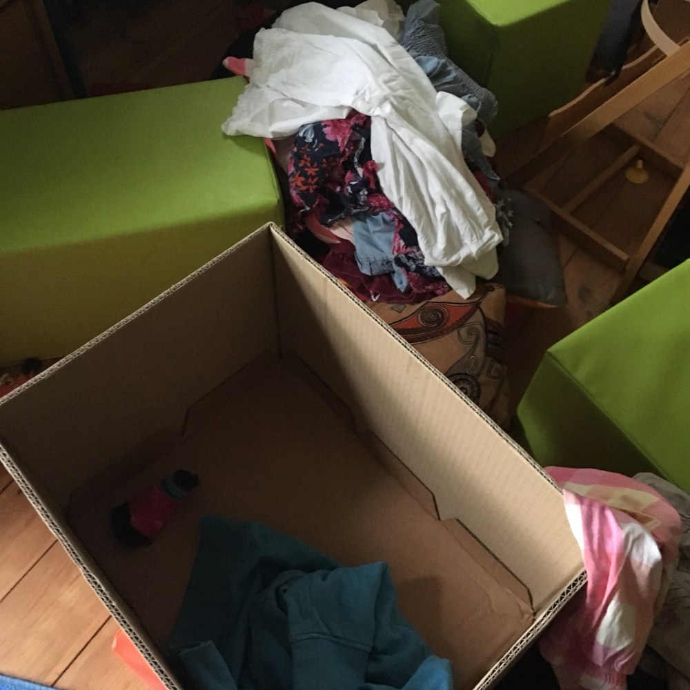 [folienstern:] „Da wär noch eine Kleiderkiste zu sortieren…“