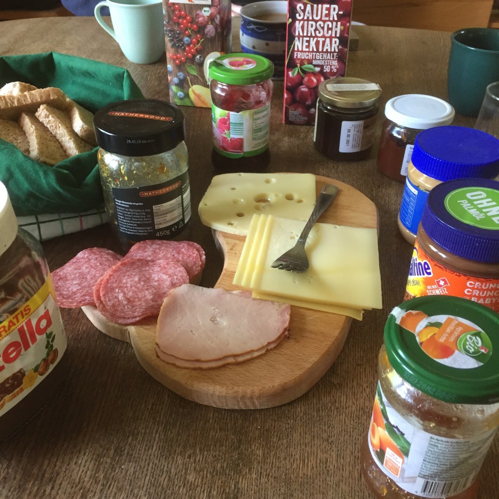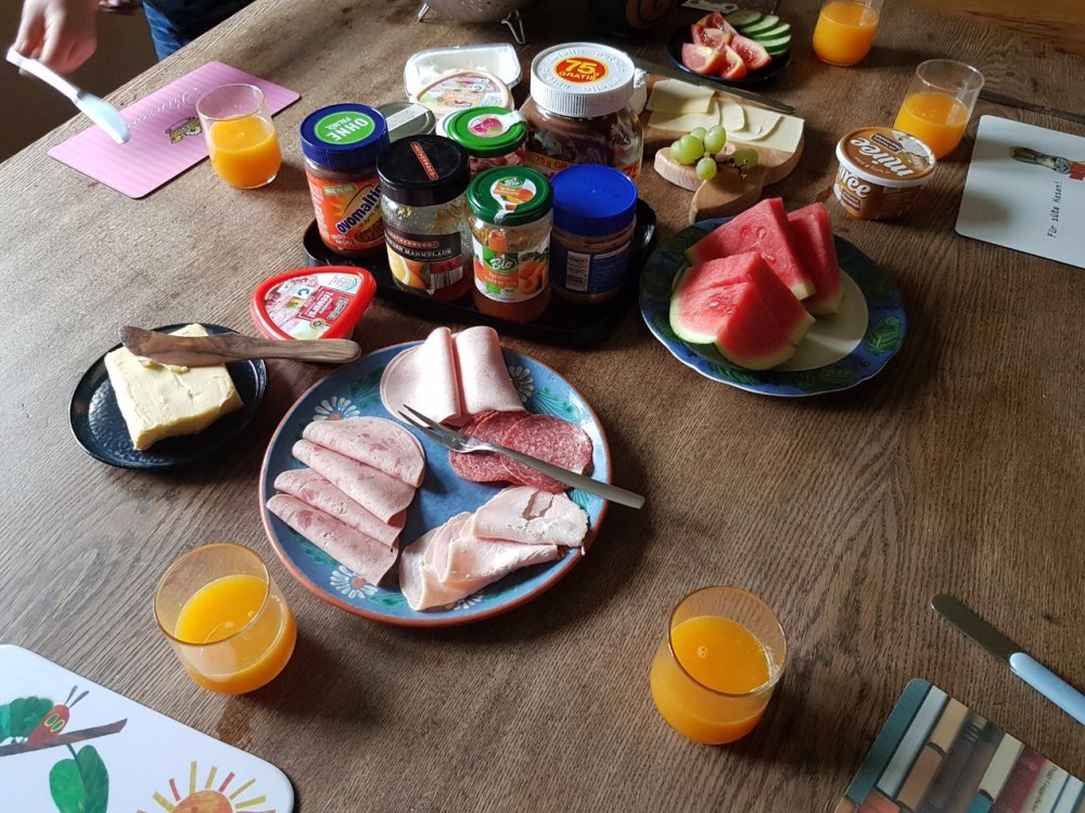 [KM:] „Oh, lecker Orangensaft! Und Brötchen!“