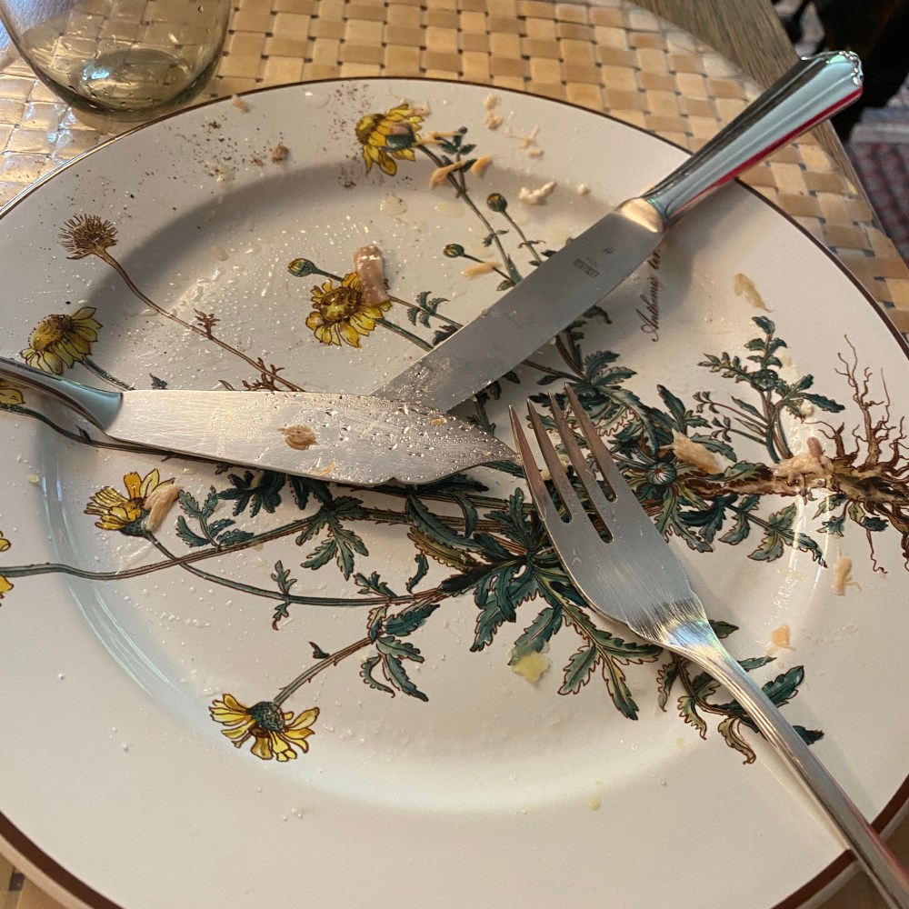 [kneteeis:] „Ach, so legt man das Besteck hin, wenn man drei Teile benutzt hat? Das wusste ich gar nicht…“