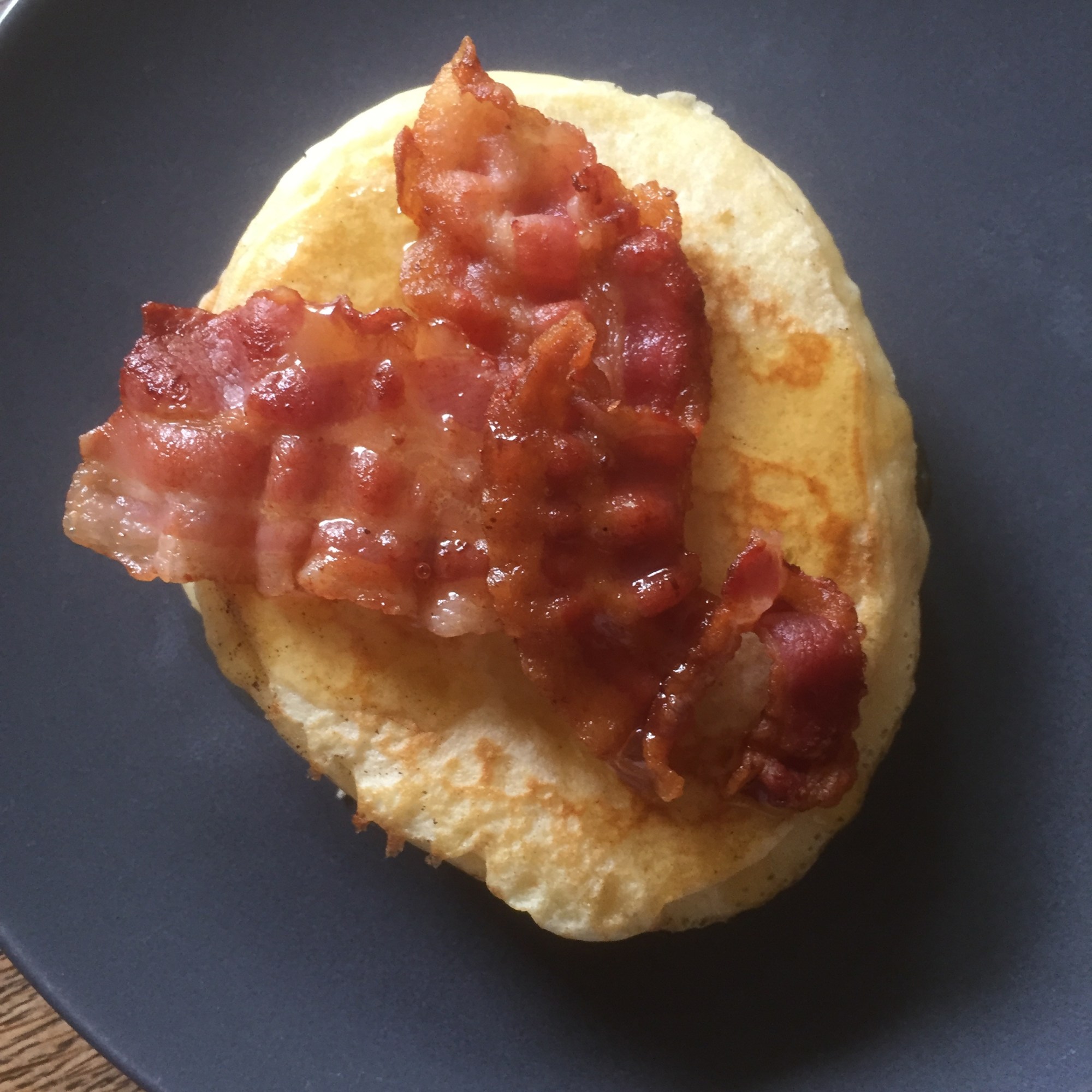 [folienstern:] „Pfannkuchen mit Speck. Und Ahornsirup.“