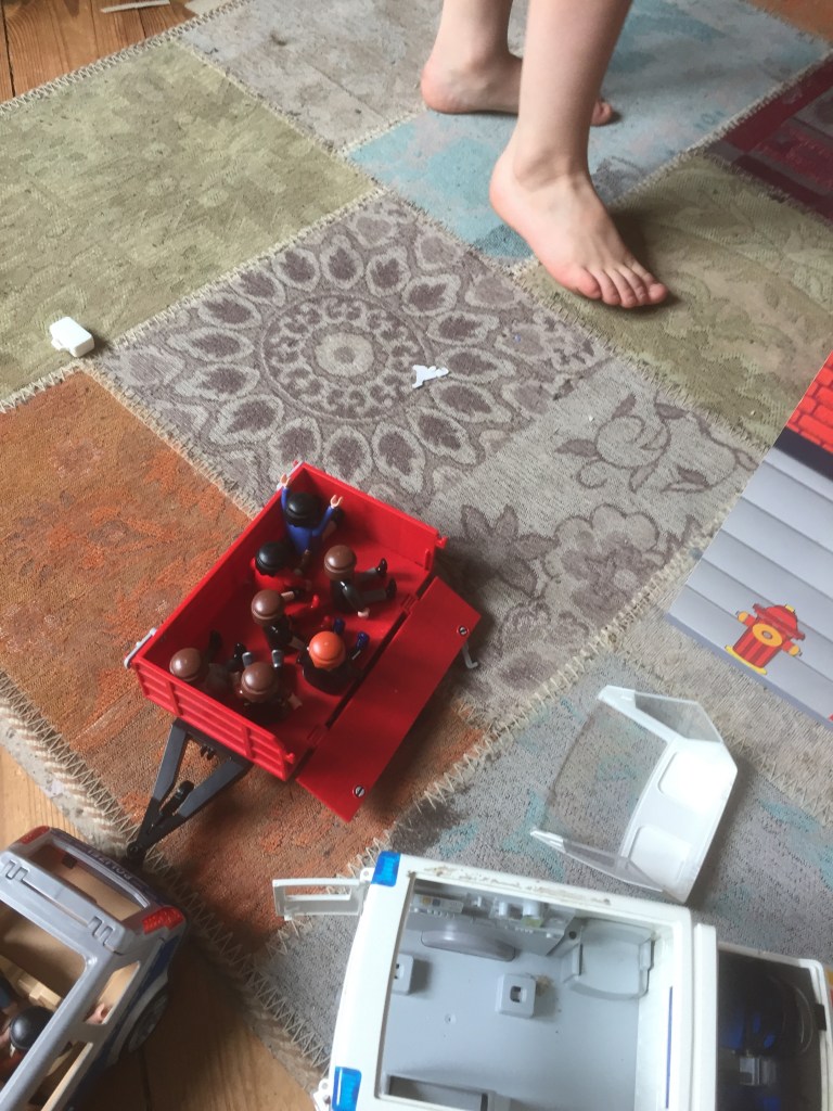 [KJ:] „Jetzt räume ich alle Menschen in den Wagen. Mama, mach mir mal bitte die Räder ab, sonst wackelt der so!“