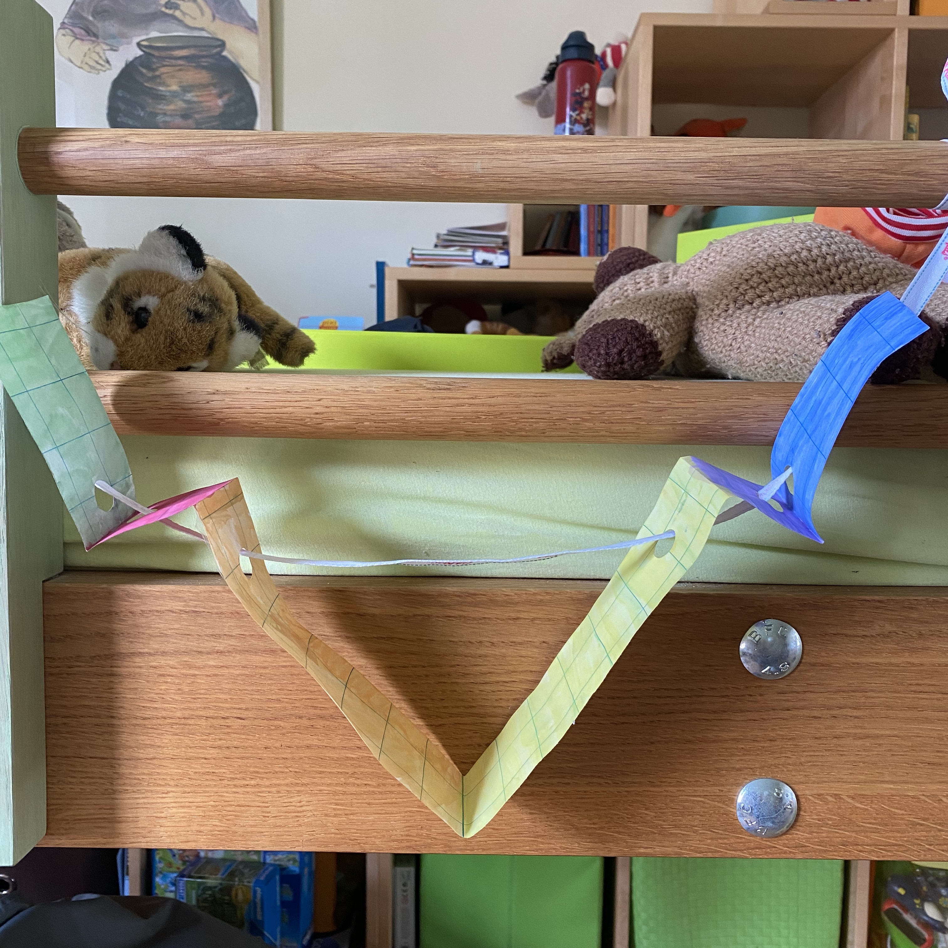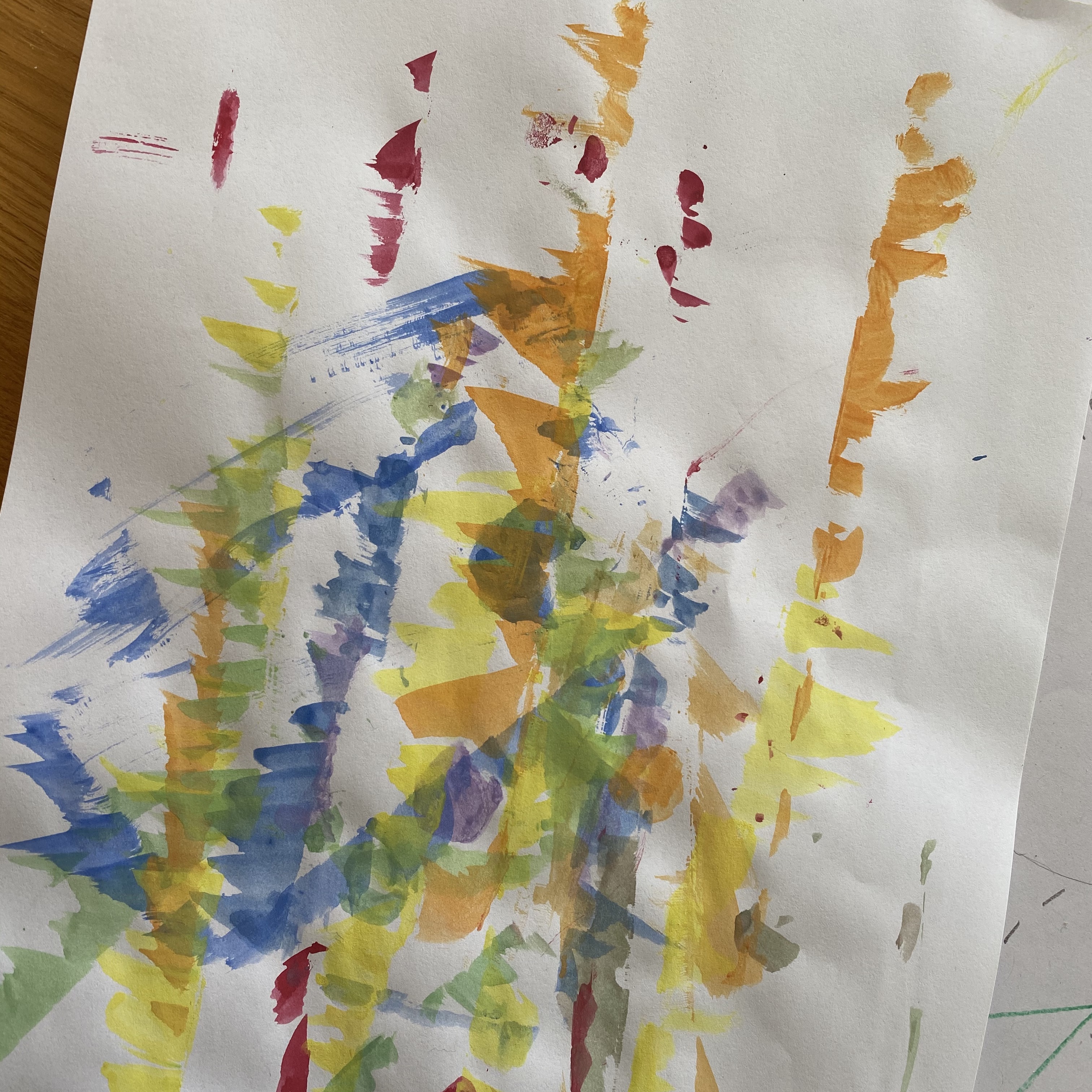 [Etwas später. GJ:] „Guck‘ mal: Ich habe zwei Kunstwerke gemacht. Das eine hängt jetzt bei mir am Bett, und das andere ist übrig geblieben.“