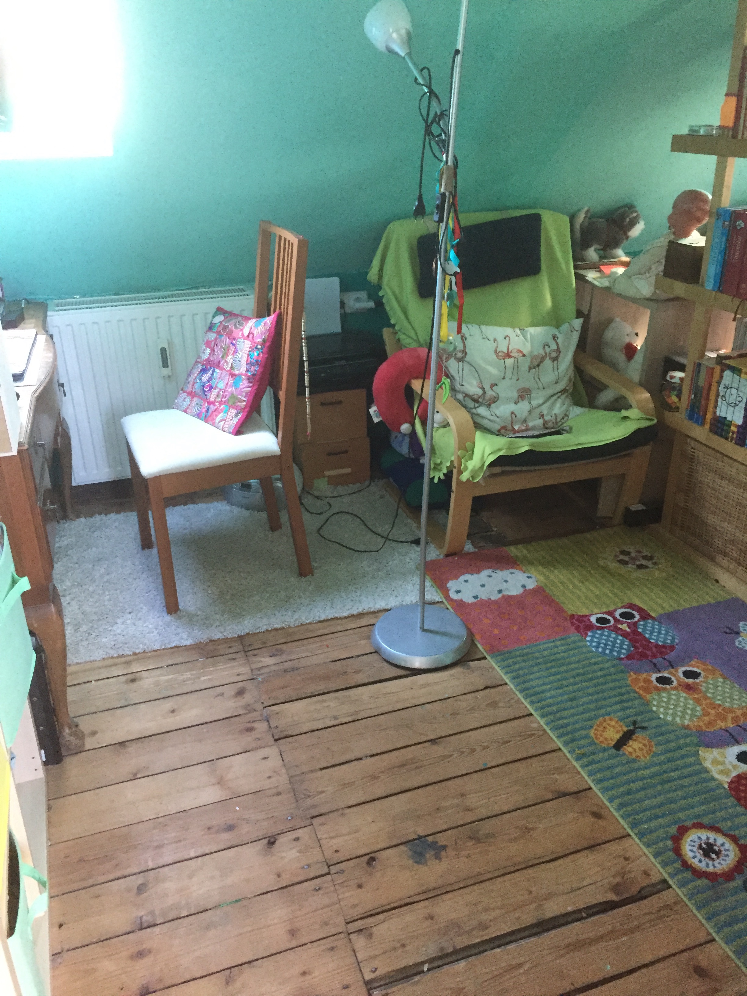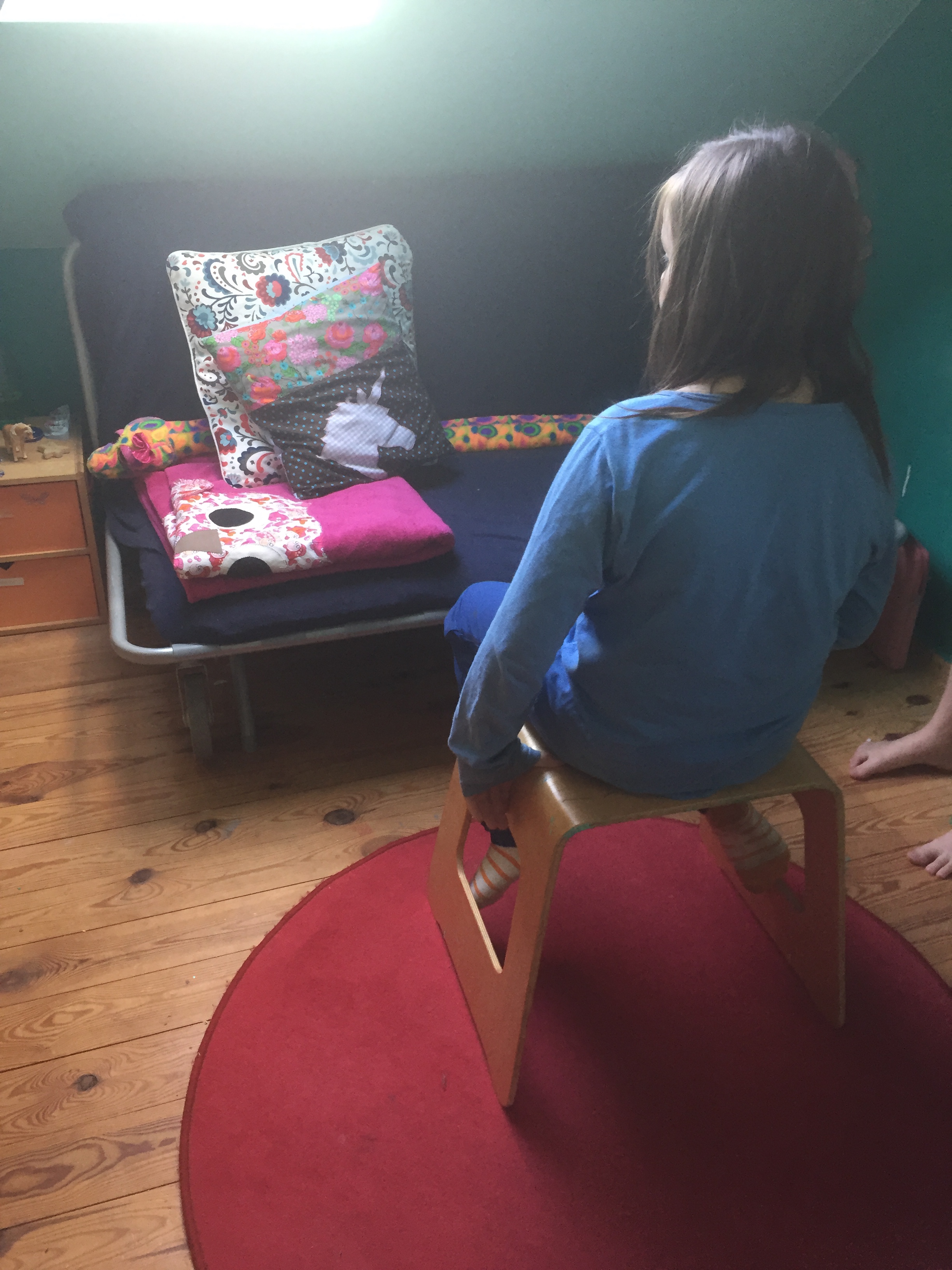 [GM:] „Jetzt kannst Du gucken kommen! Guck‘ – ich habe alles ganz gründlich aufgeräumt. Und alle Schubladen! Guck, und alle Kissen, die ich nicht brauche, sind hier unter dem Stuhl. Und mein Bett klappe ich jetzt jeden Tag zusammen.“