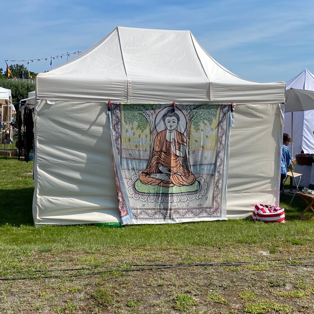 [Etwas später. kneteeis:] „Ach, guck‘ an: Der Kunsthandwerkermarkt findet sogar statt – und die haben ihr Zelt mit einem Buddha-Bild dekoriert, wie nett!“