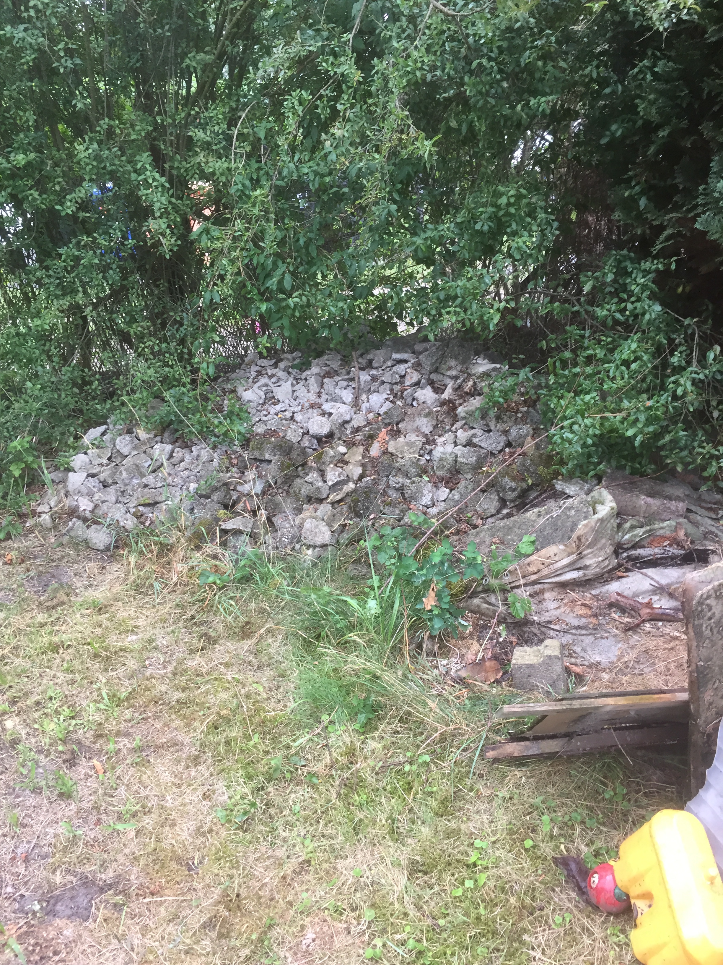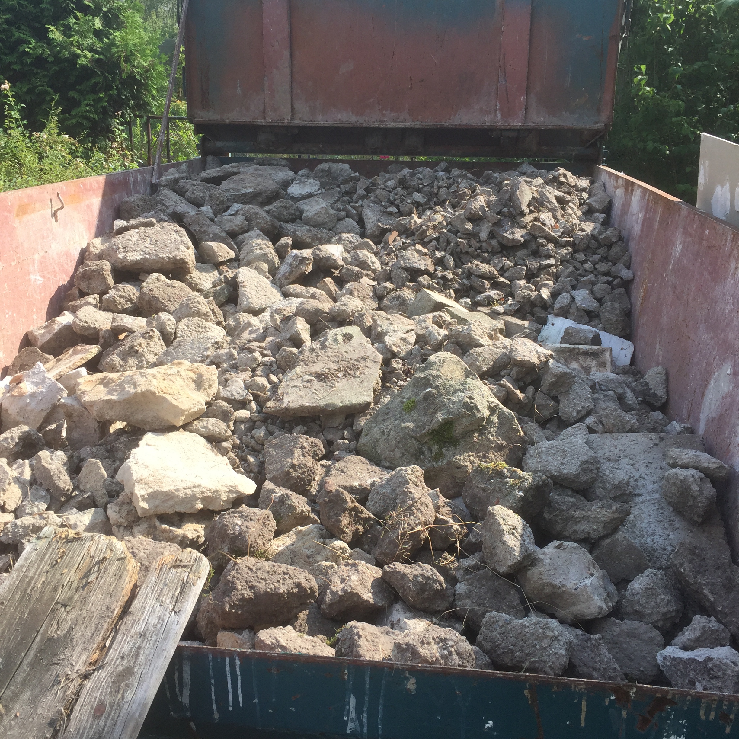 [Später. folienstern:] „Haufen weg, Container fast voll – krass – 5,5 m3 Steine aus dem Garten geholt!“