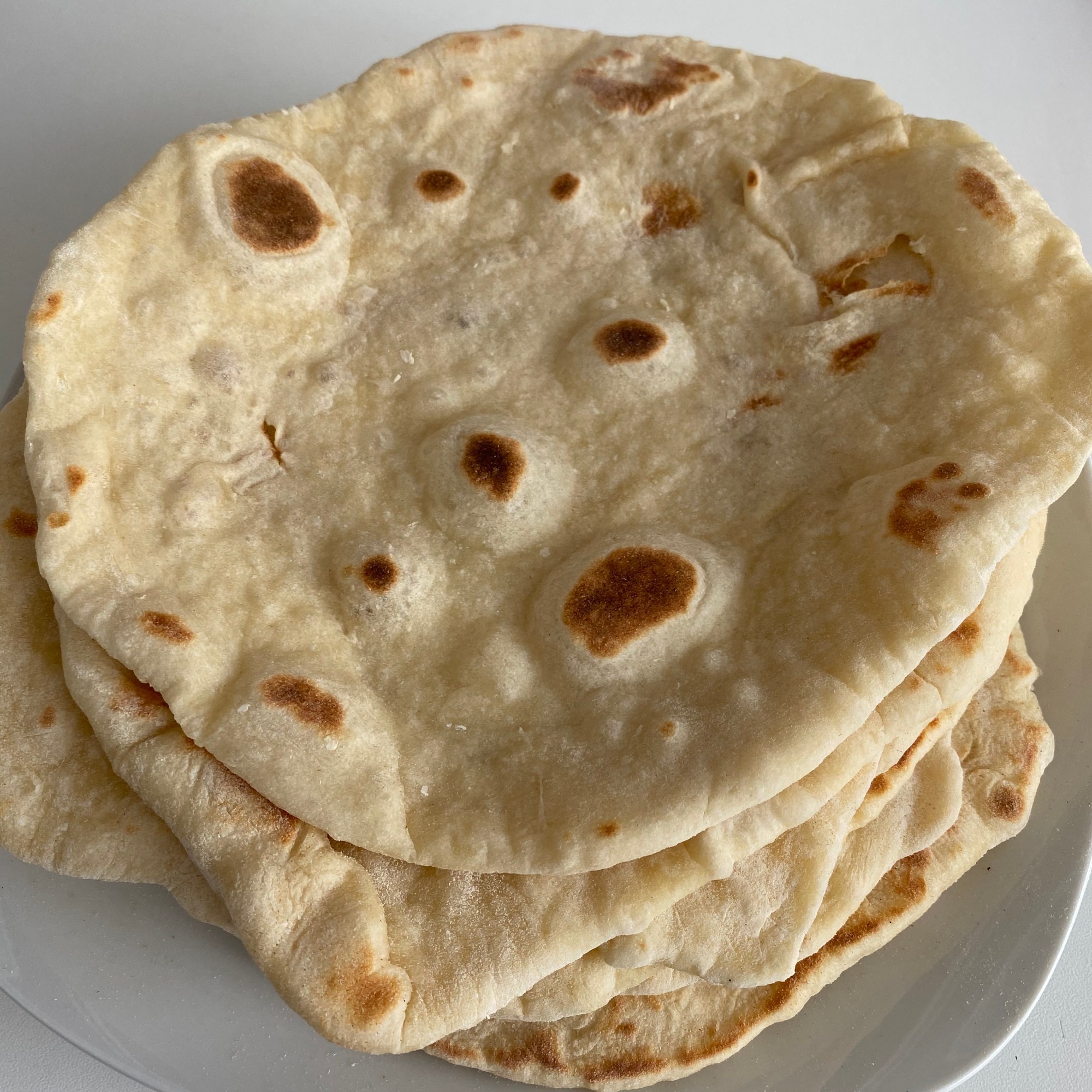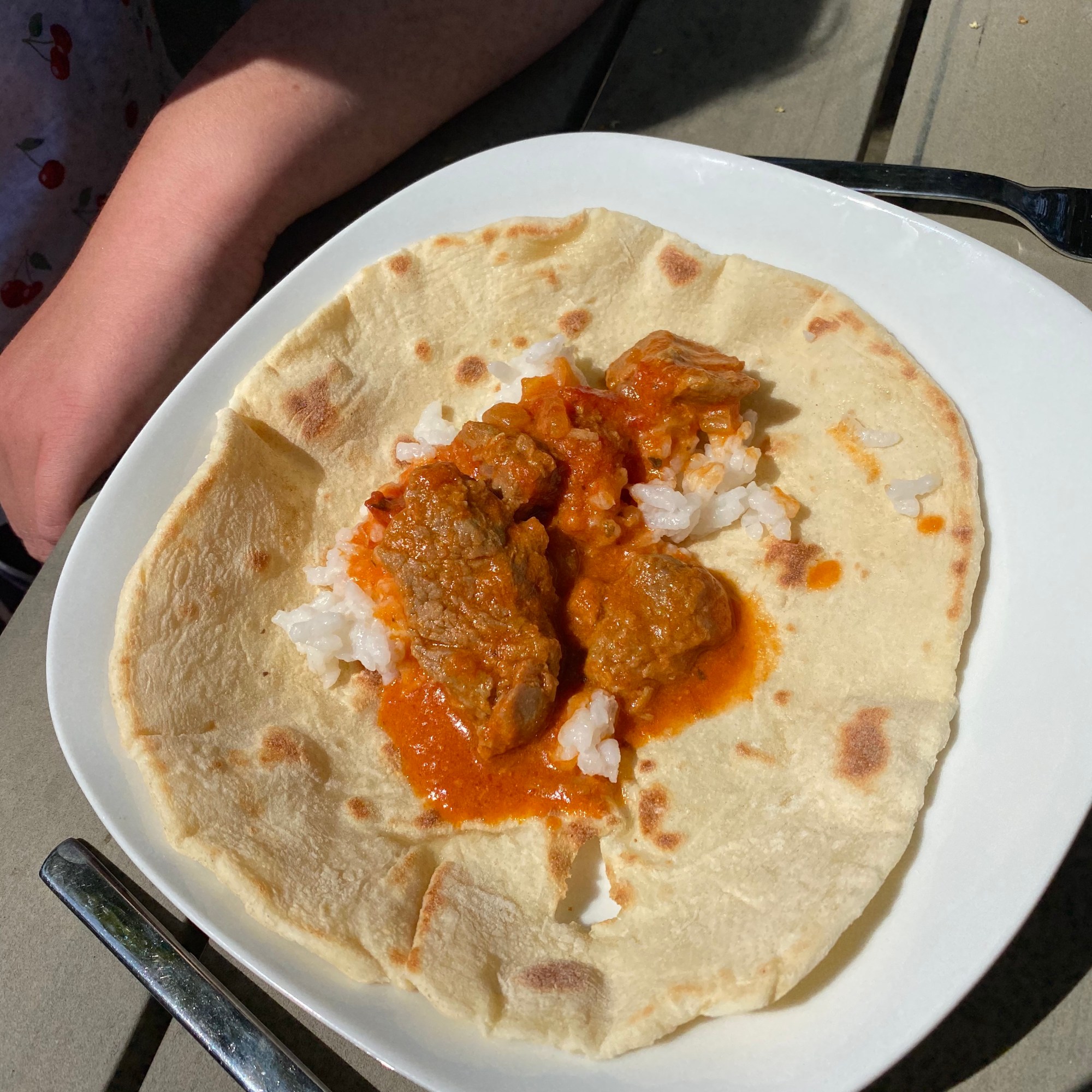 [kneteeis:] „Ich habe Hühnchen Indisch gemacht, allerdings mit Kalbsfleisch. Und dazu habe ich Naan selbst gebacken!“