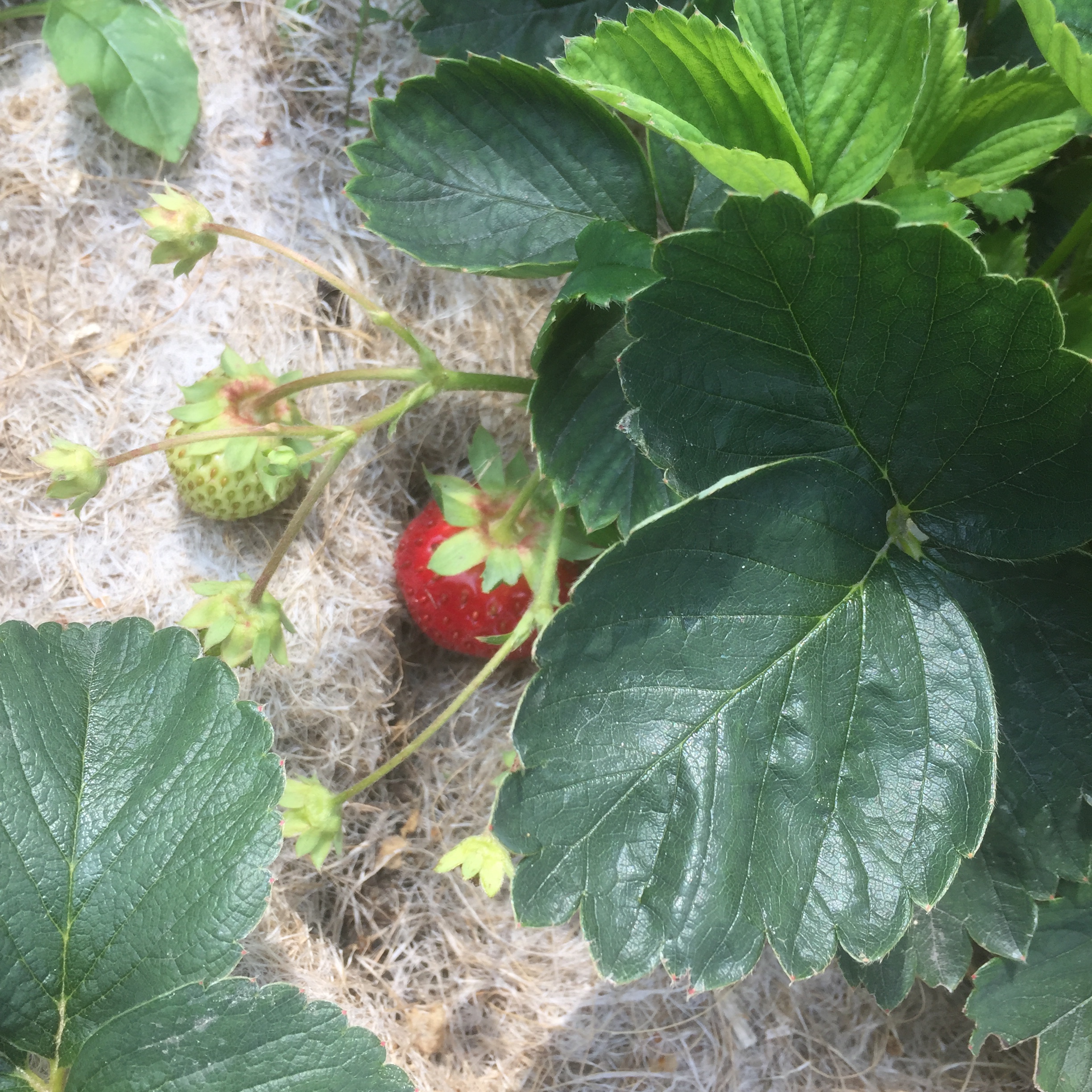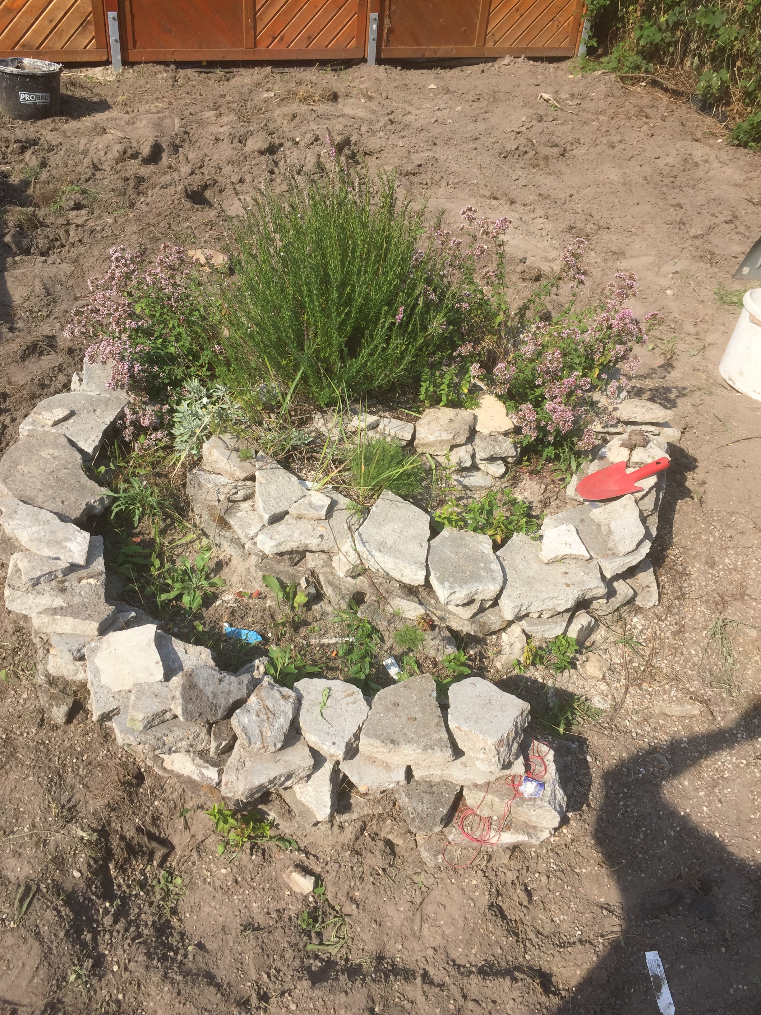 [folienstern:] „Brrr, ist das heiß. Ich hör‘ mal auf; um die Kräuterspirale rum und dahinter sieht’s ja schon besser aus. Ach, und die eine Erdbeere da nehme ich gleich mal mit.“