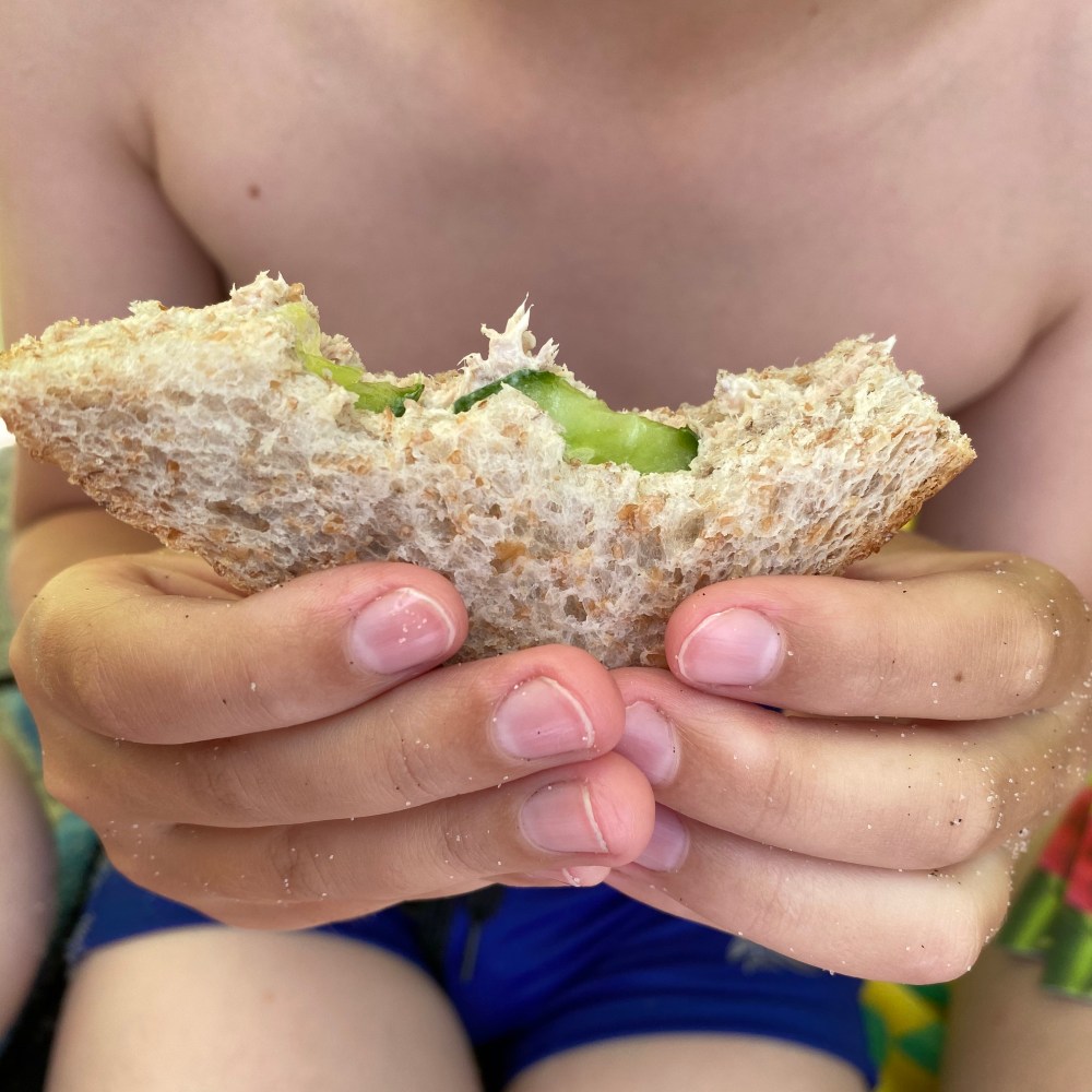 [GM, GJ:] „Wir ziehen uns auch gleich um, aber dann essen wir erst ein Thunfischsandwich. Dann ist es erst richtig Weststrand.“