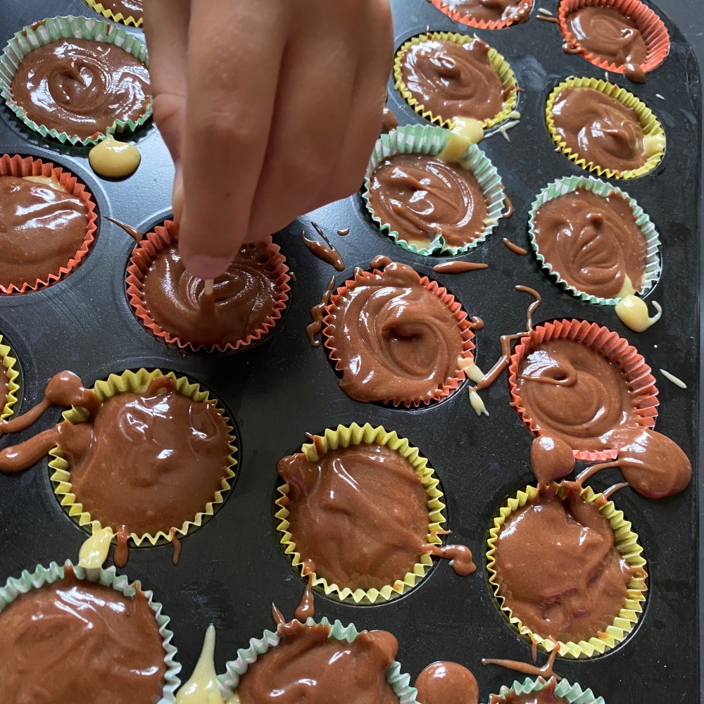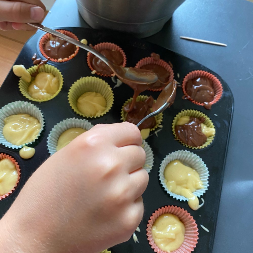 [GJ:] „Okay. Du darfst mit dem Teig anfangen, aber ich fülle den dann in die Förmchen.“