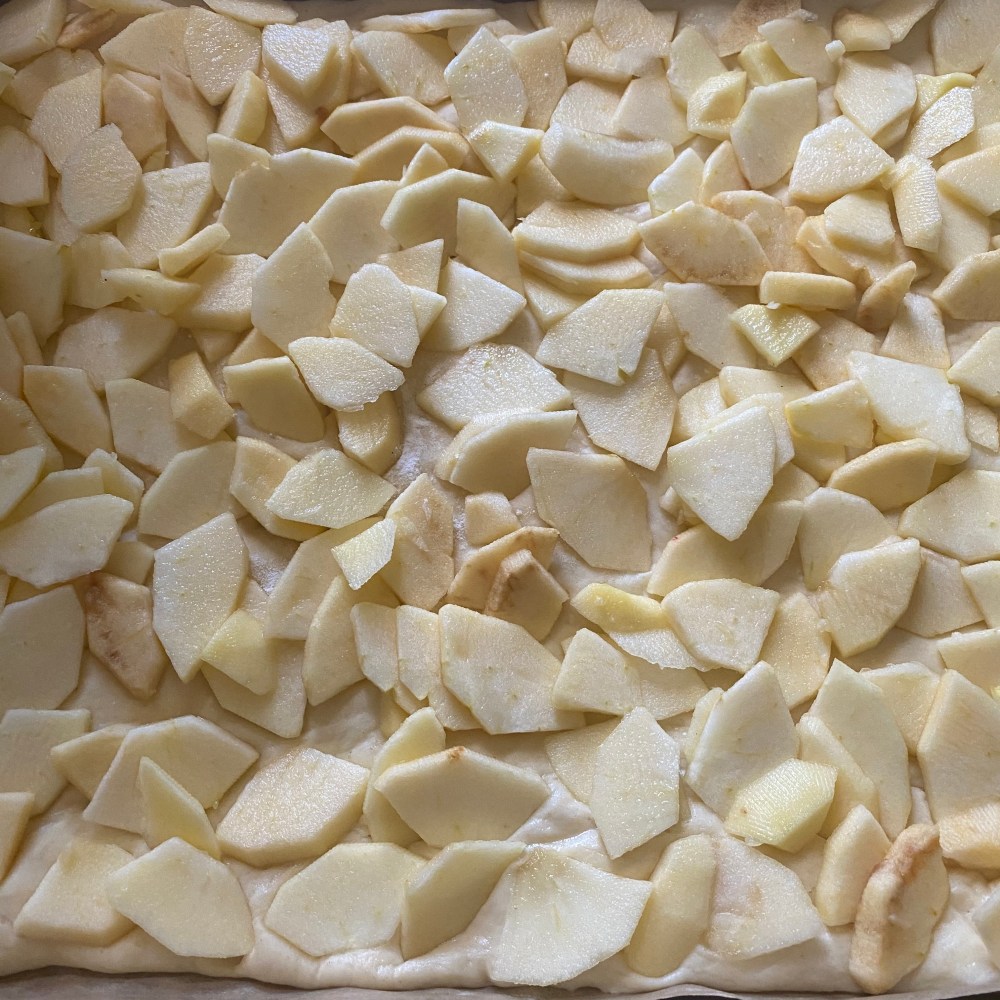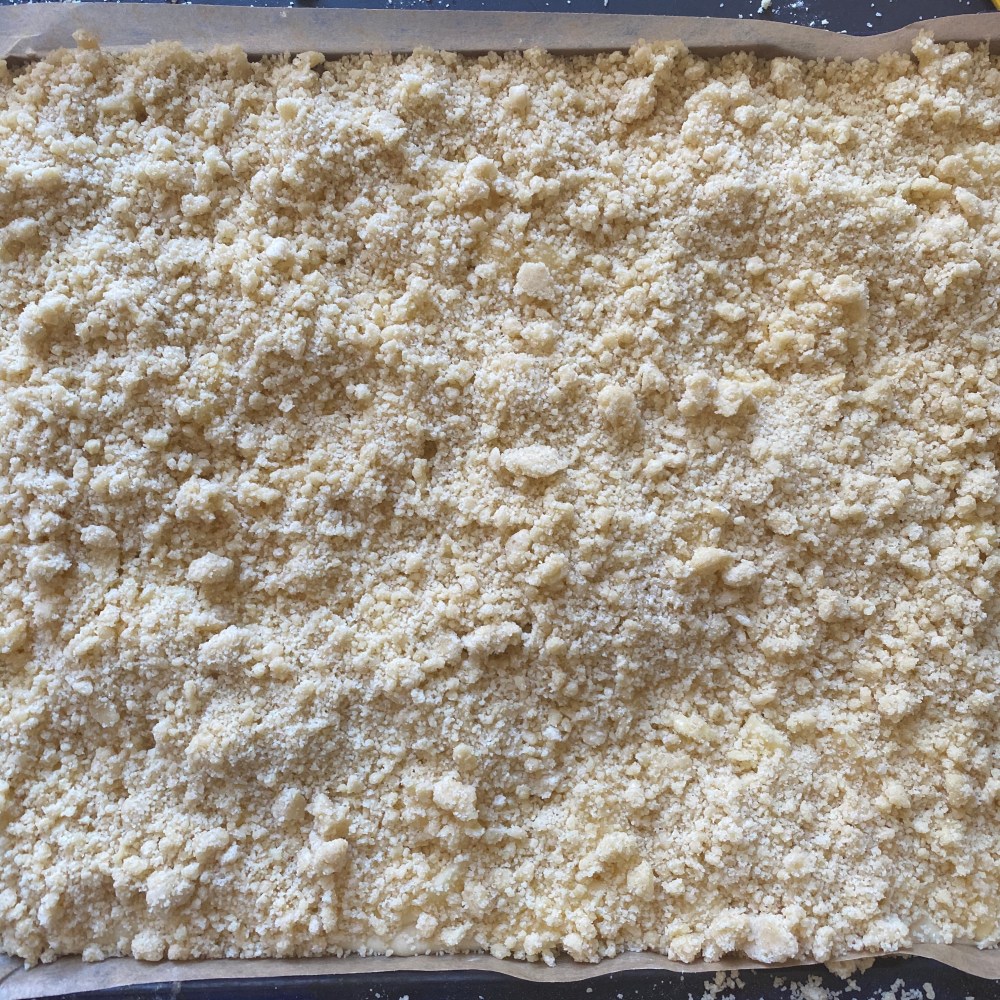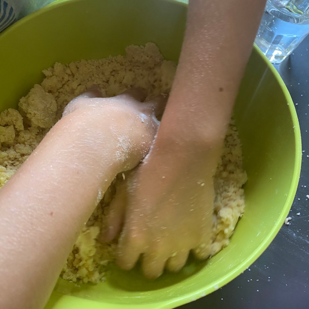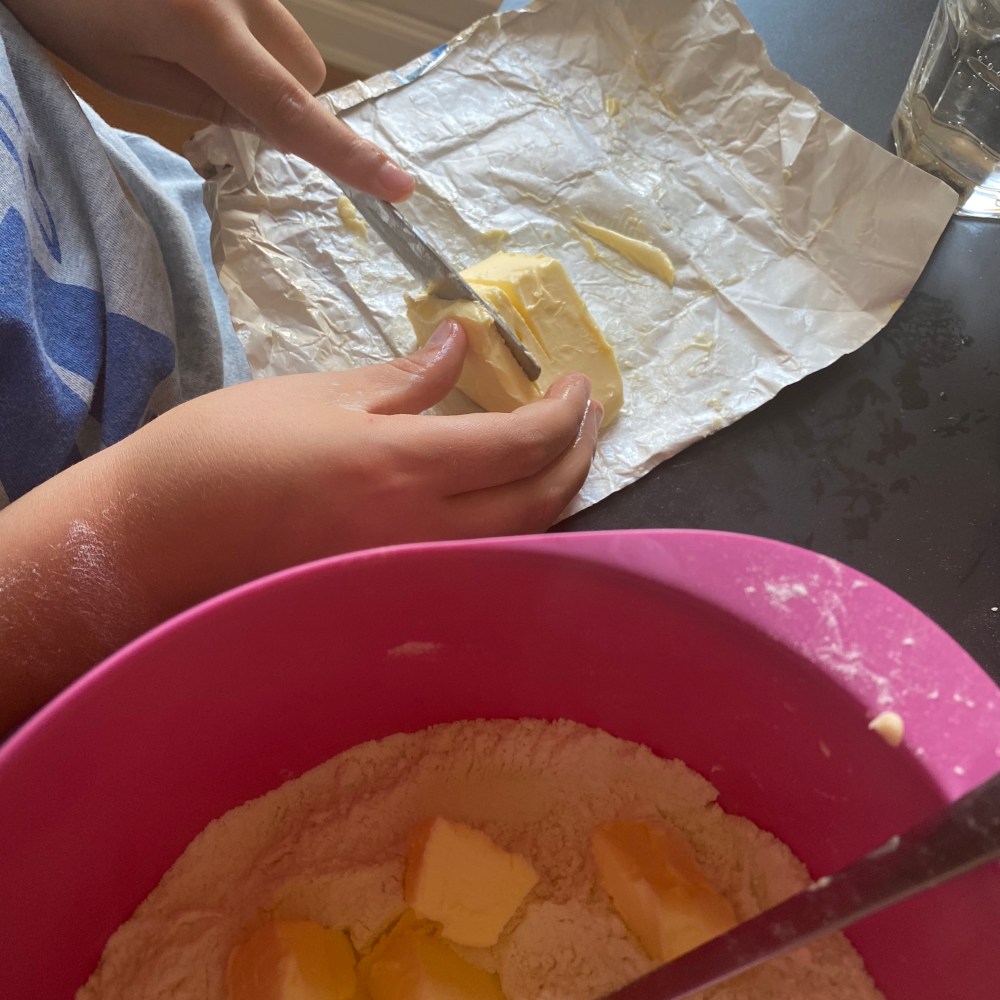 [GJ:] „Ich mache die Streusel! Als erstes muss ich die Butter in dreieckige Stücke schneiden – guck‘ mal, so!“