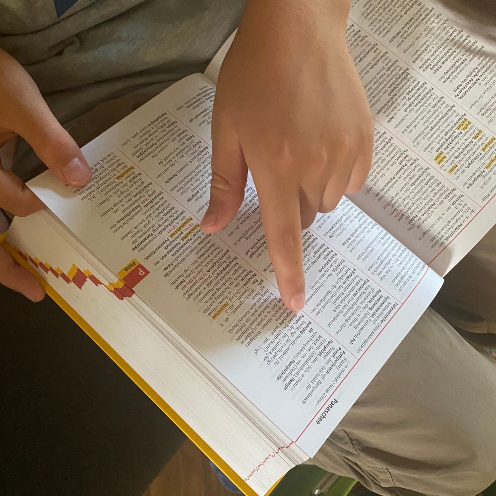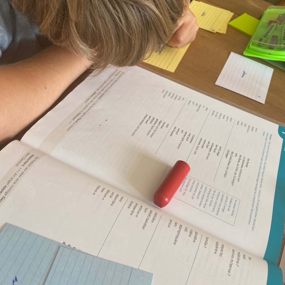 [GJ:] „Ich schreibe noch meine restlichen Vokabelkarten für Latein. Dann kann Opi mich nachher abfragen.“