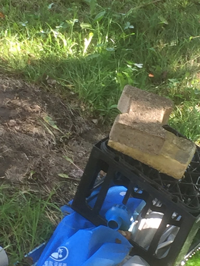 [Vater:] „Klappt, wenn ich den Stein da auf die Kiste stelle. Und jetzt wissen wir gleich, dass der Garten ein Gefälle zum Tor hin hat!“