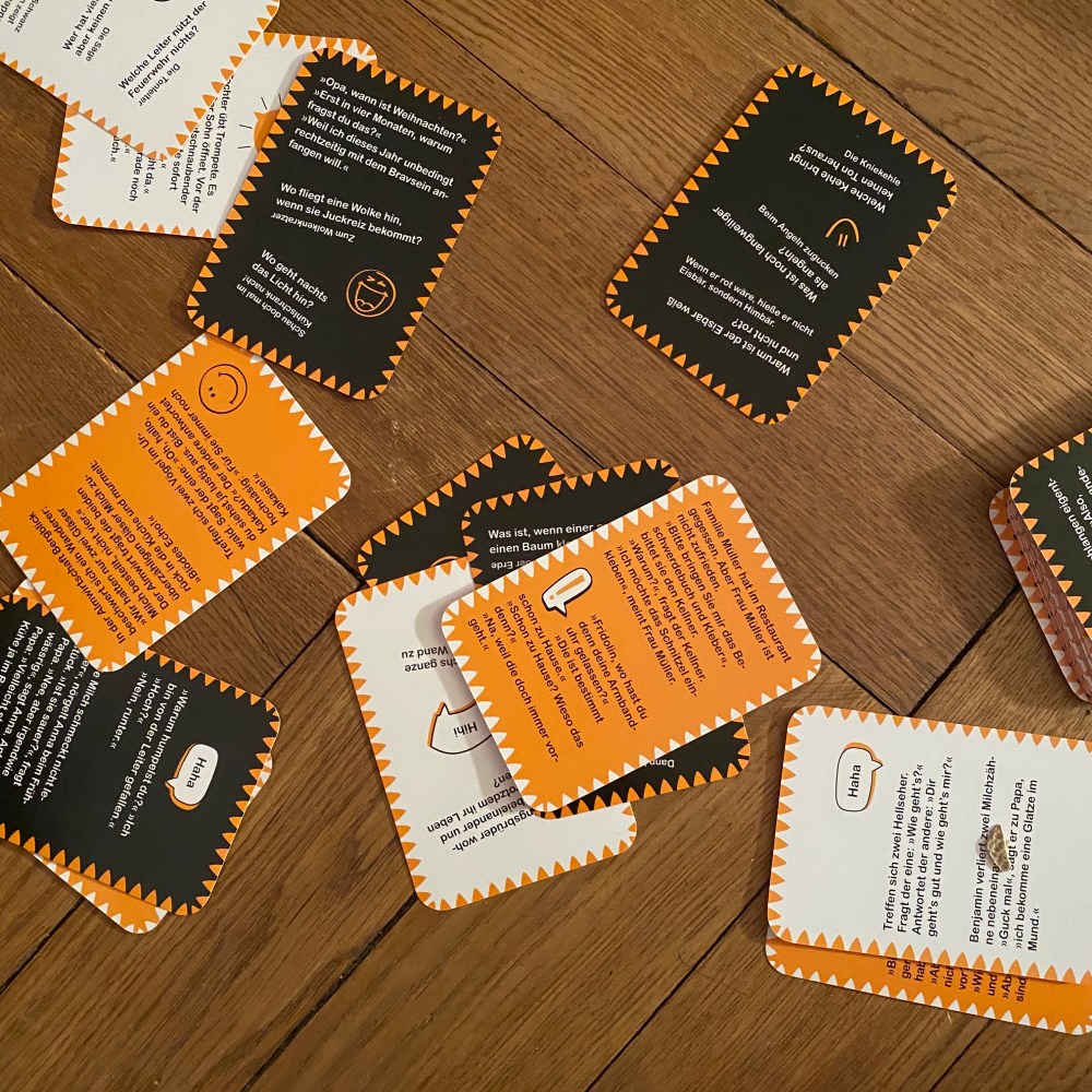 [Kurz darauf. GJ:] „Guck‘ mal: Bei der Geburtstagsfeier habe ich ein Kartenspiel mit Witzen bekommen!“