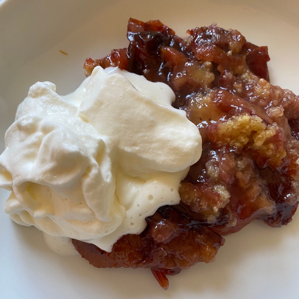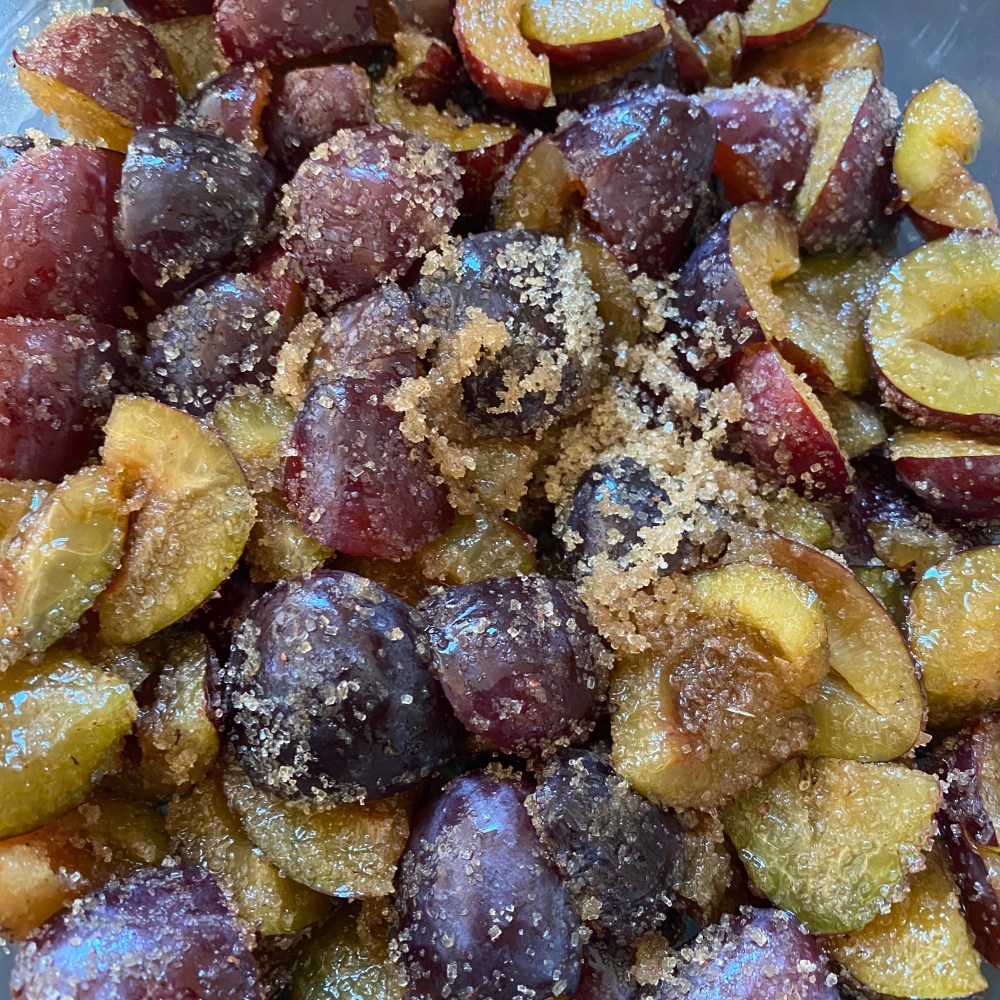 [kneteeis:] „Zwetschencrumble, mit den Zwetschen aus der Gemüsekiste.“