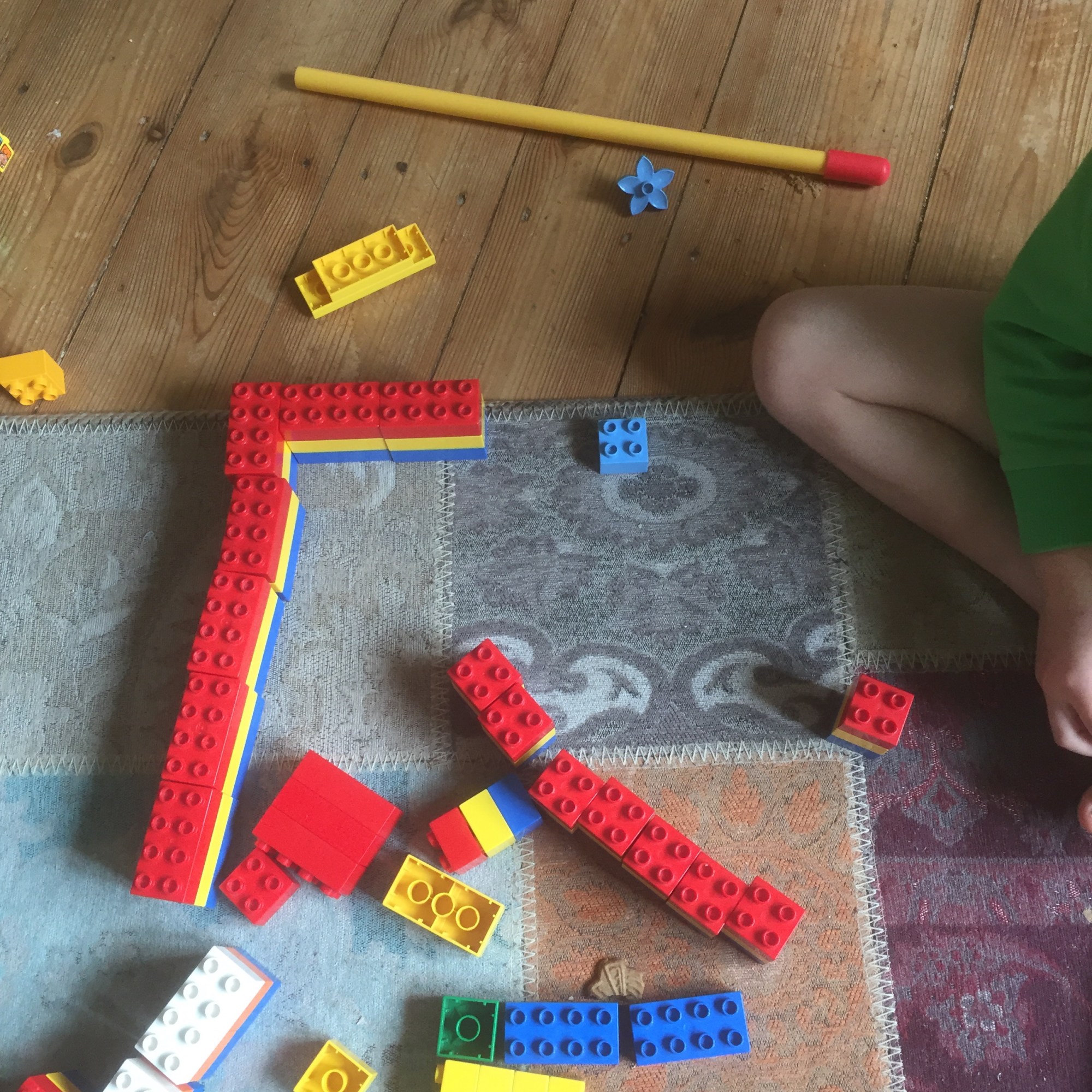 [KJ:] „Guck mal, blau, gelb, rot, ich mache eine Reihe. Und mit dem Regenbogen mache ich eine Brücke. Guck mal, die können übereinander stehen!“