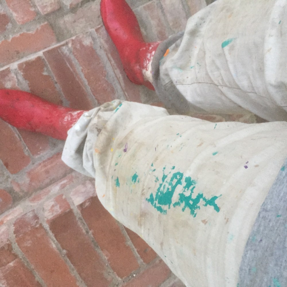[KJ:] „Hier ist eine Schüssel. Hihi, Mama, das passt! Das T-Shirt und die Hose und Stiefel haben alle Farbflecken!“