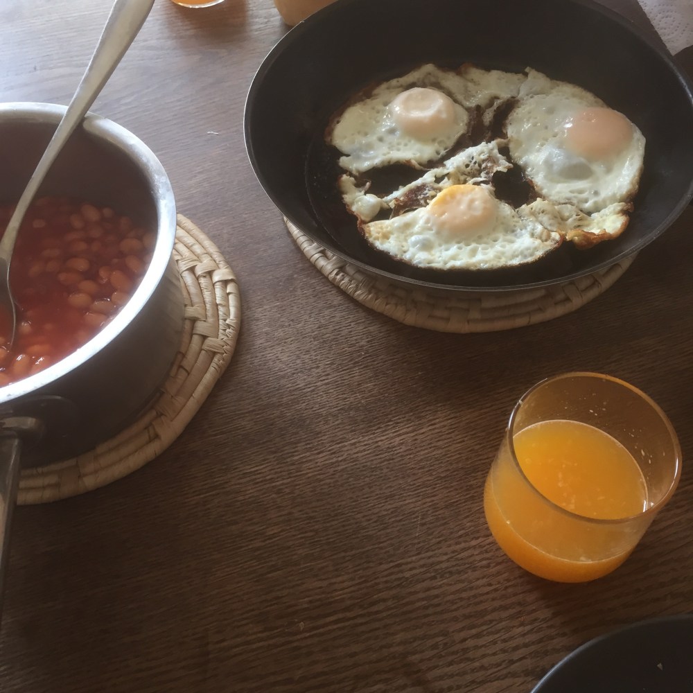 [GM: ] „Ja – Spiegelei und Baked Beans und Speck und O-Saft und Toast!“