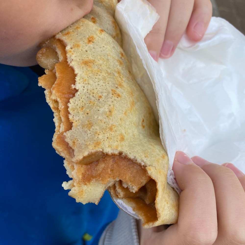 [GJ:] „Okay. Kann ich stattdessen ein Crêpe? Mit Apfelmus und mit Zimt und Zucker?“