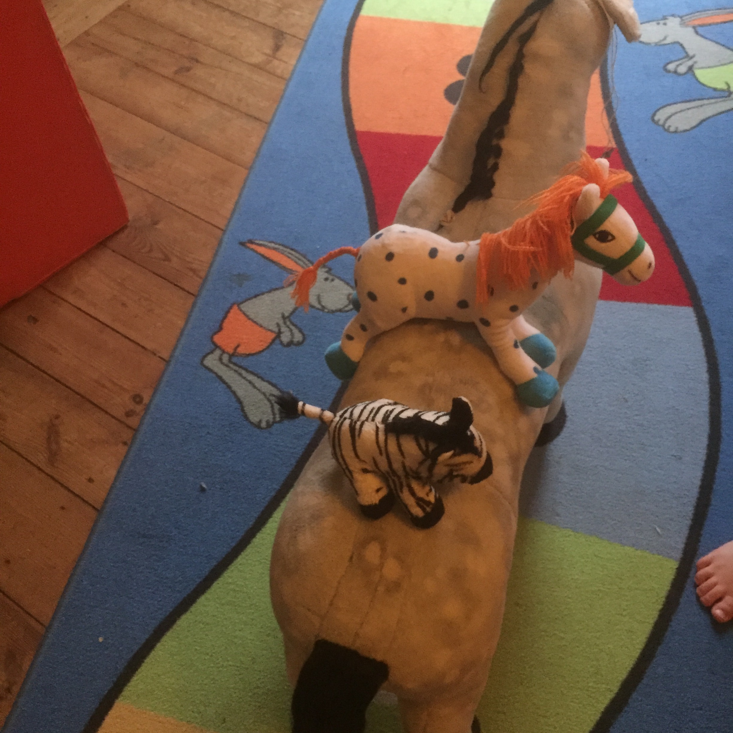 [KM:] „Ja. Und jetzt haben wir einen Zoo. Guck mal, das Zebra ist bei den Pferden. Und wir haben zwei Giraffen!“