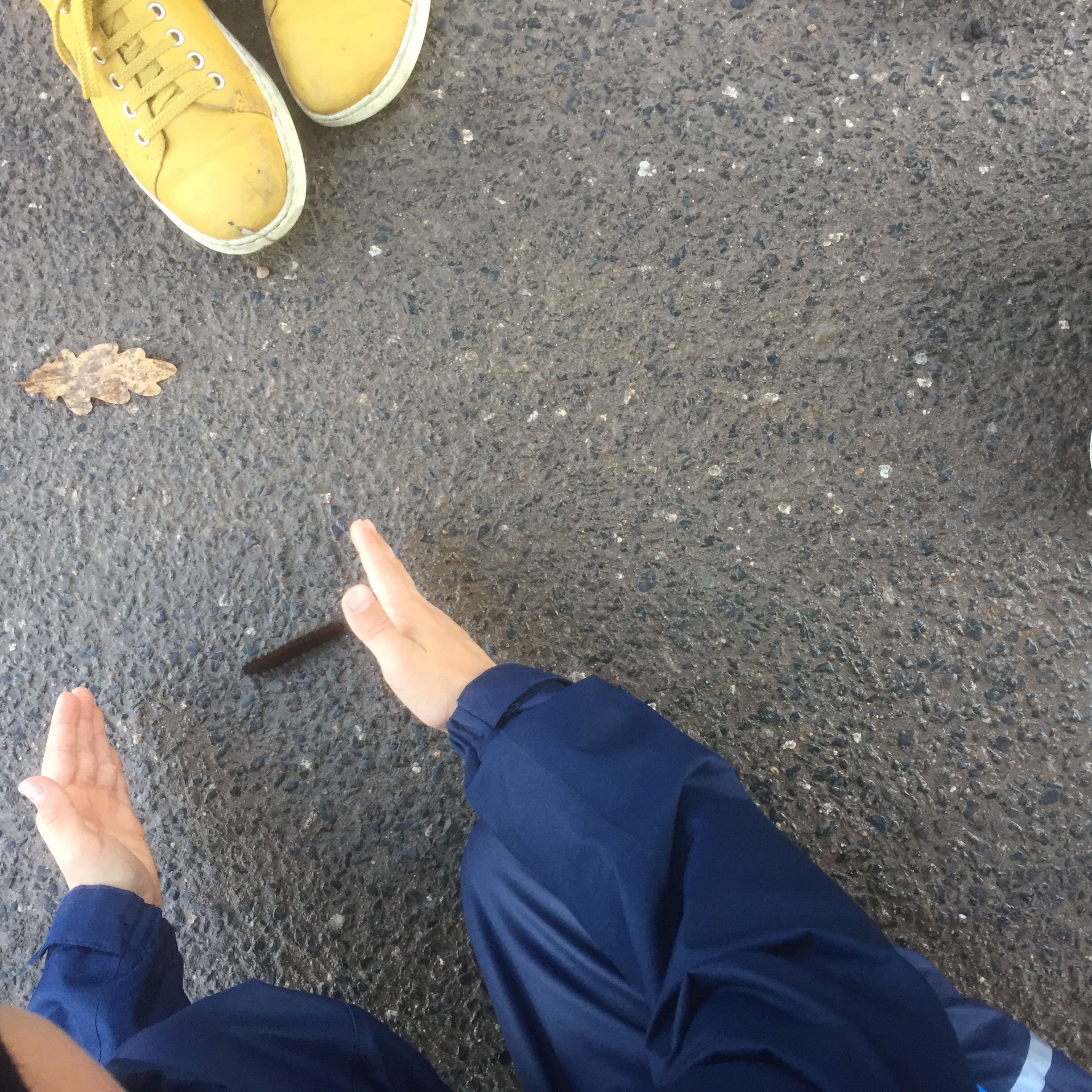[Auf dem Weg. Freund:] „Guckt mal, die Raupe!“