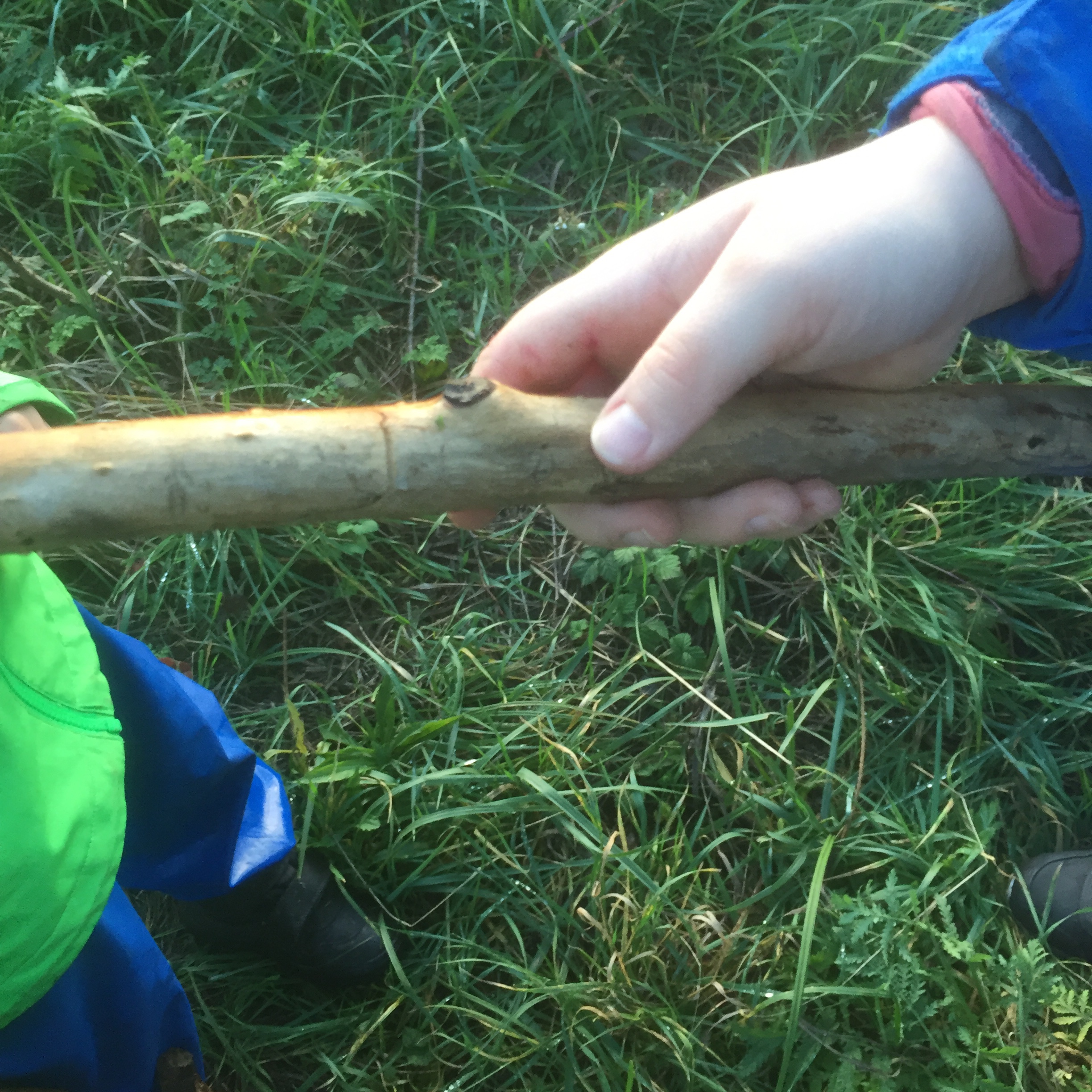 [Später. KM:] „Guckt mal, ich kann meinen Stock an die Mauer hängen!“