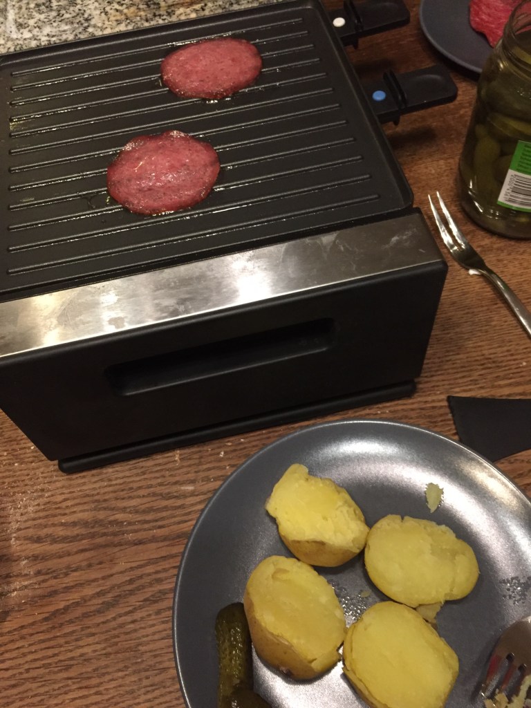 [Vater:] „Da können wir jetzt gleich das neue Raclettegerät ausprobieren. Und genügend Pfannen für Weihnachten, wenn die Hamburger da sind, haben wir dann auch.“