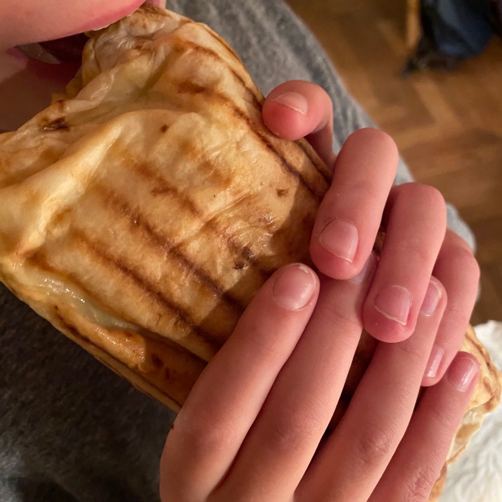 [kneteeis:] „Ah, gut, dass Du so schnell wieder da bist! Die Burritos sind schon hier! Und ich habe Deinen extra ohne Bohnen bestellt.“