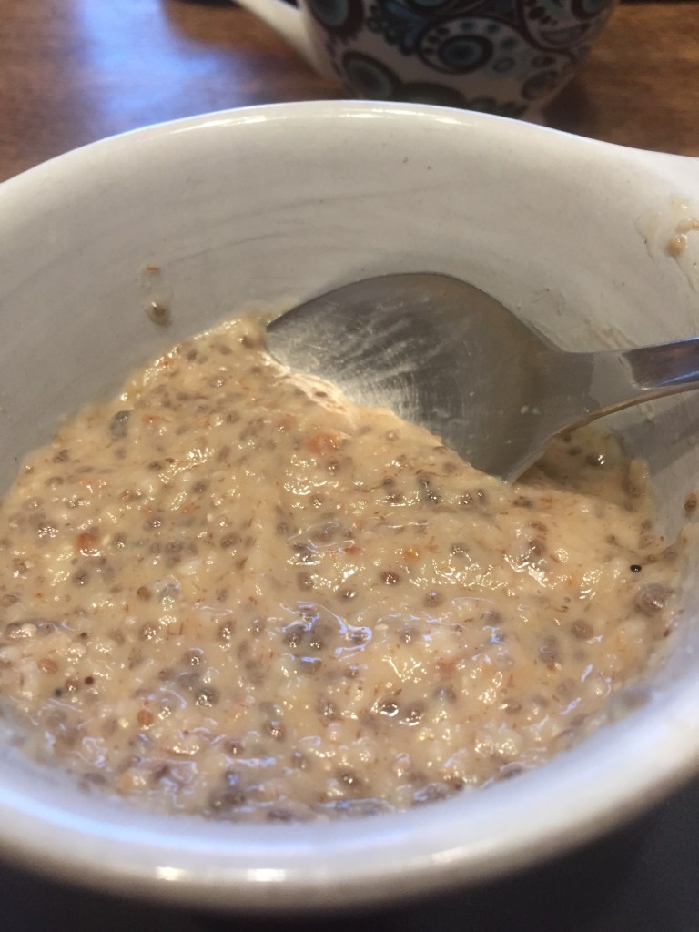 [folienstern:] „Ich wollte mal diesen Getreidebrei probieren. Dafür müssen wir Chia-Samen einweichen.“