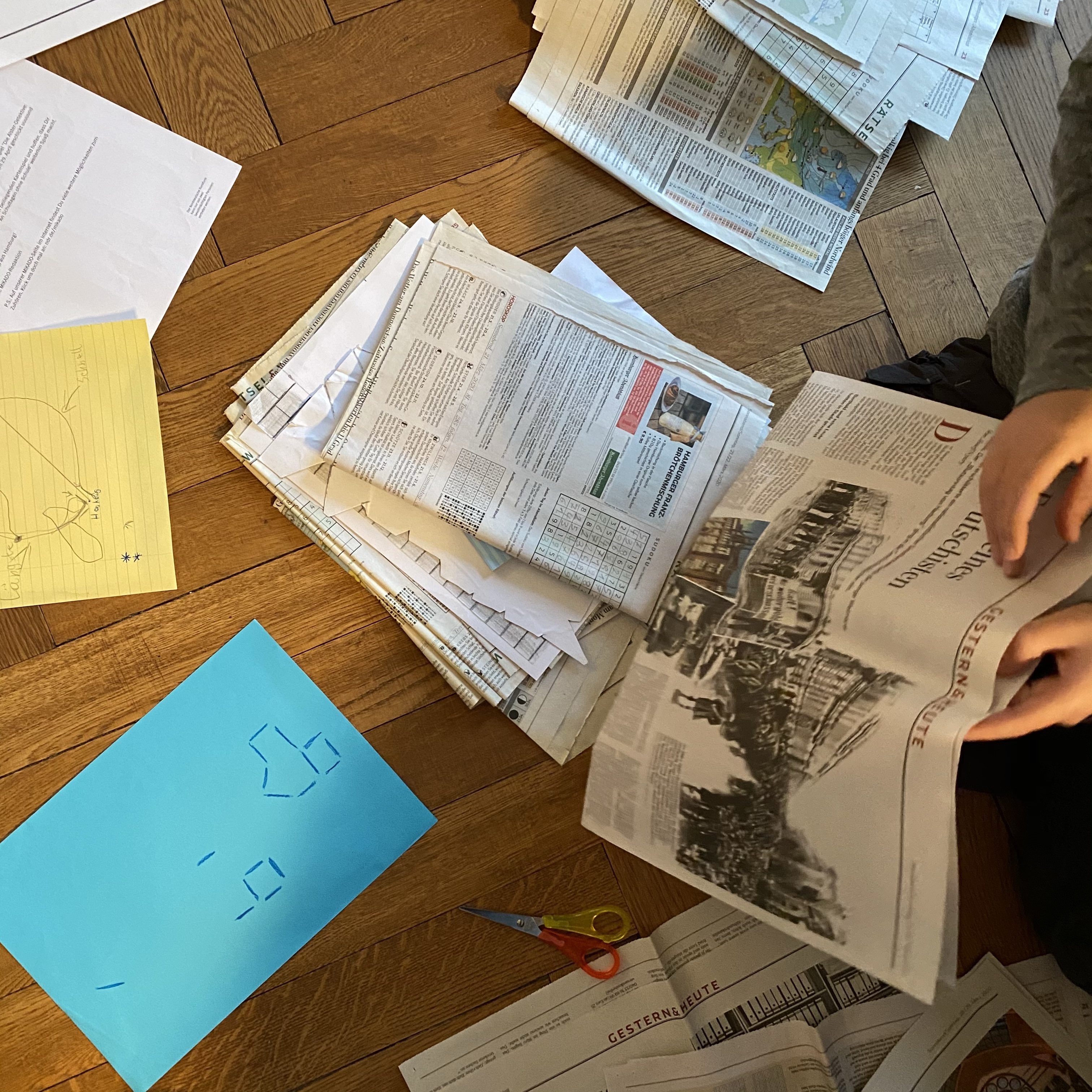 [GJ:] „Nein. Ich räume jetzt meine Tischhälfte auf. Ich mache erstmal Stapel, und dann sortiere ich die Stapel durch.“