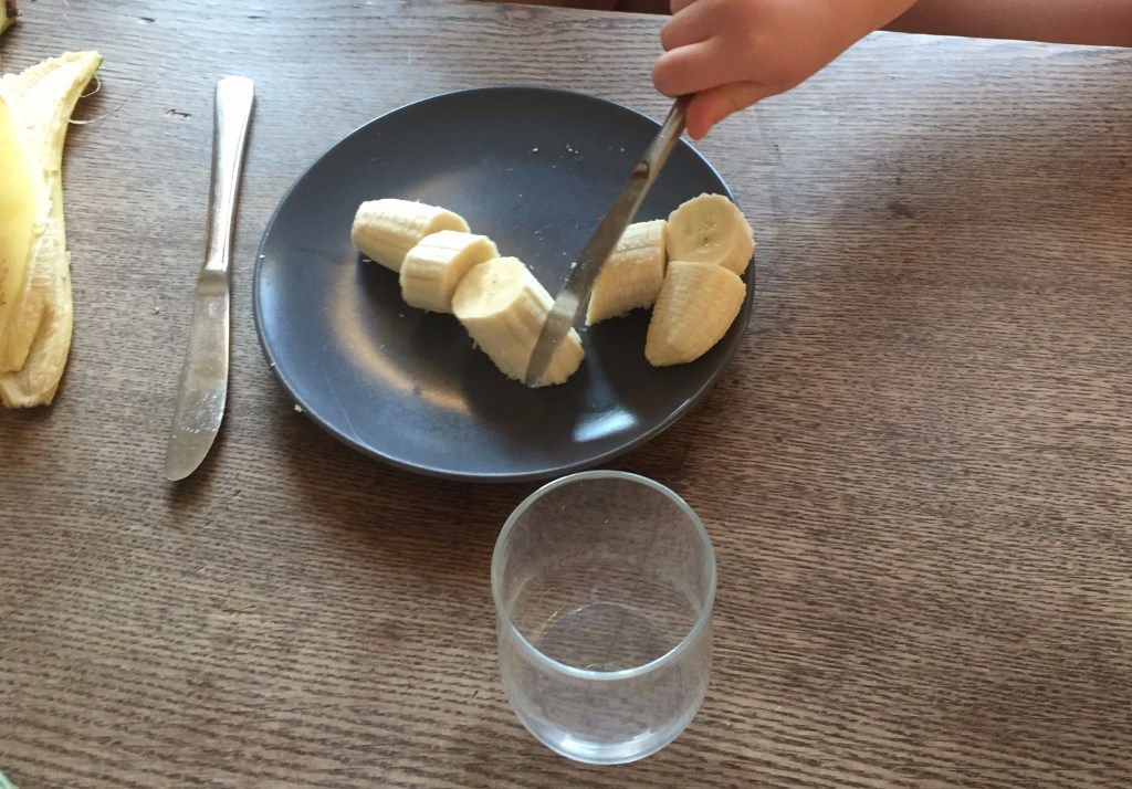 [KJ:] „Ich schneide, ich schneide, ich schneide die Banane. Komm, für Dich schneide ich sie auch!“
