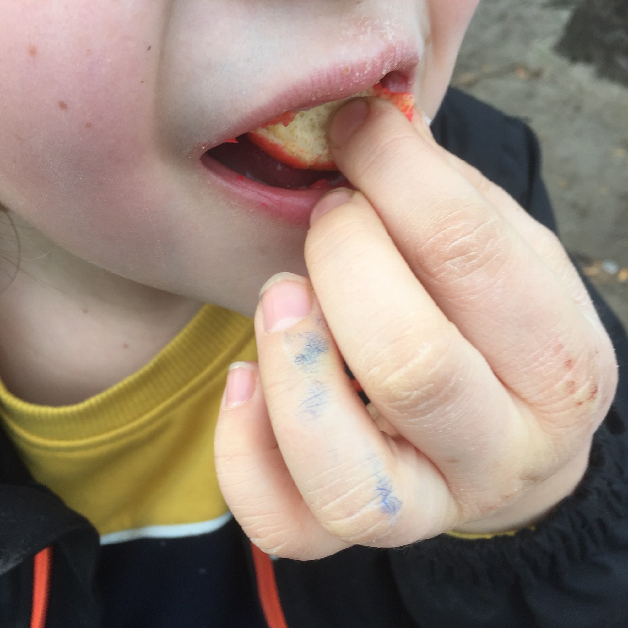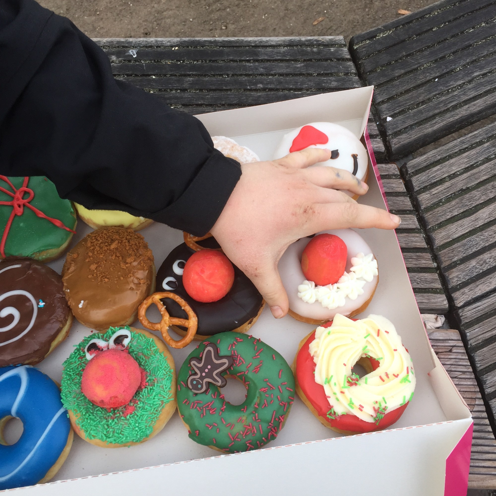 [KM:] „Und jetzt suchen wir noch Donuts aus! Und dann esse ich einen. Den mit der roten Nase. Die anderen bringen wir denen zuhause mit.“