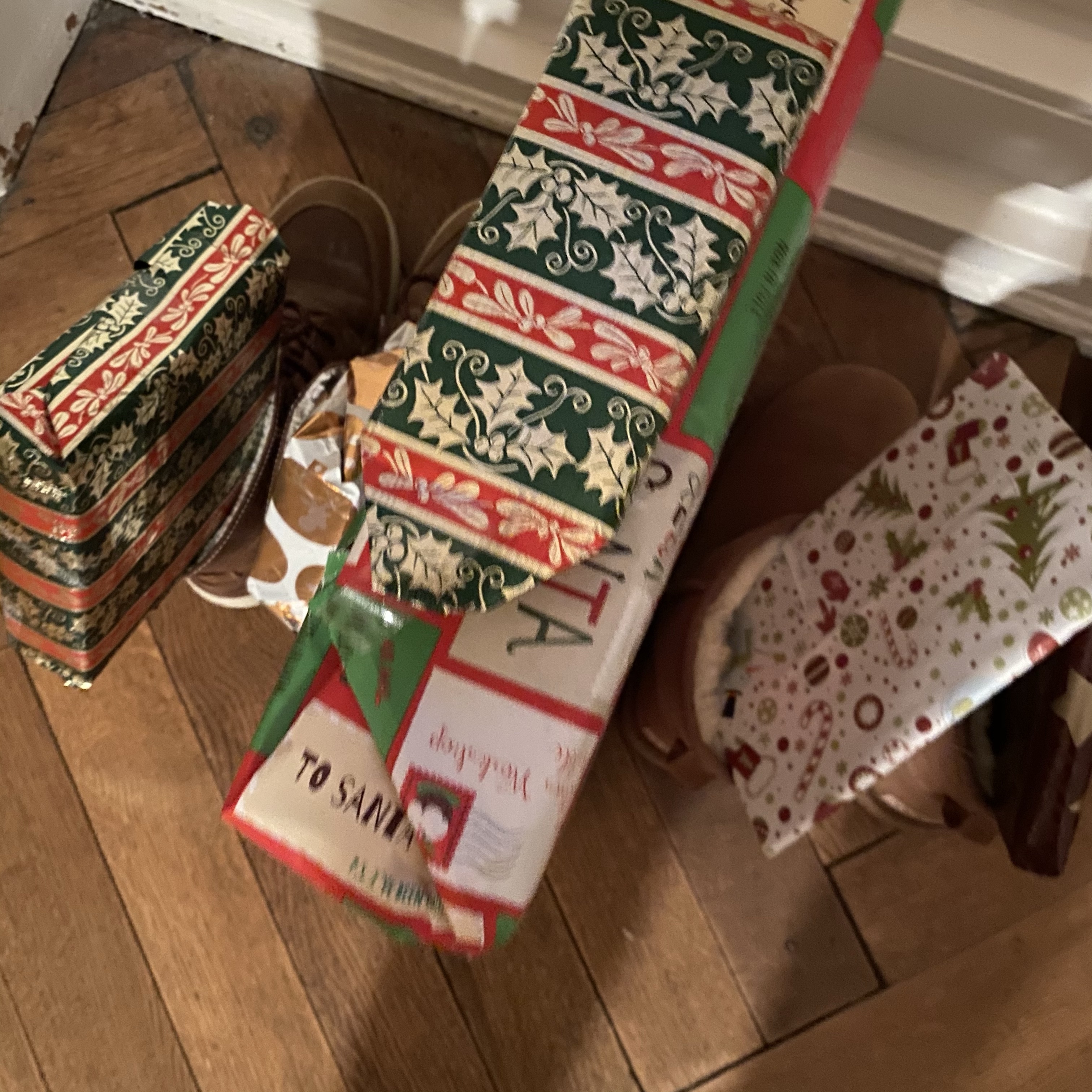 [GJ:] „Der Nikolaus war da! Und zwei Sachen stehen zwischen unseren Stiefeln! Die sind bestimmt für die uns beide! Frühstücken wir vorne? Dann mache ich schon mal die Kerzen an.“