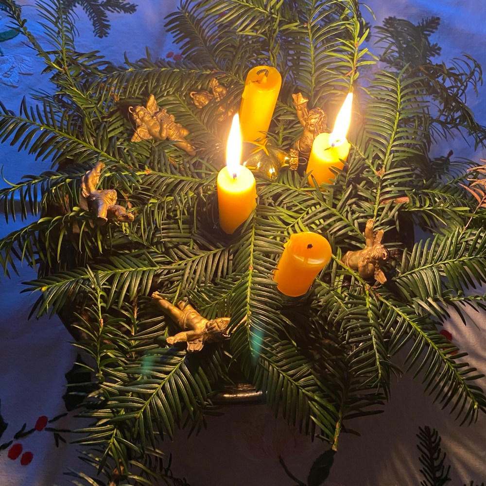 [Etwas später. GJ:] „Hier steht ja dieses Jahr gar kein Weihnachtsbaum! Warte: Ich bin der Weihnachtsbaum!“