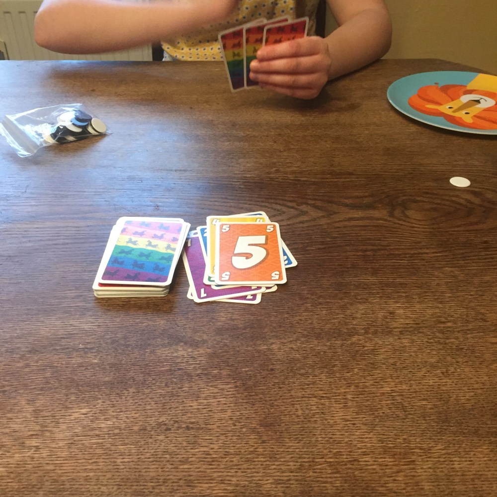 [KM:] „Coool – guck mal, zwei neue Spiele und Pokemon-Karten! Können wir das gleich ausprobieren? Das Lama-Spiel?“