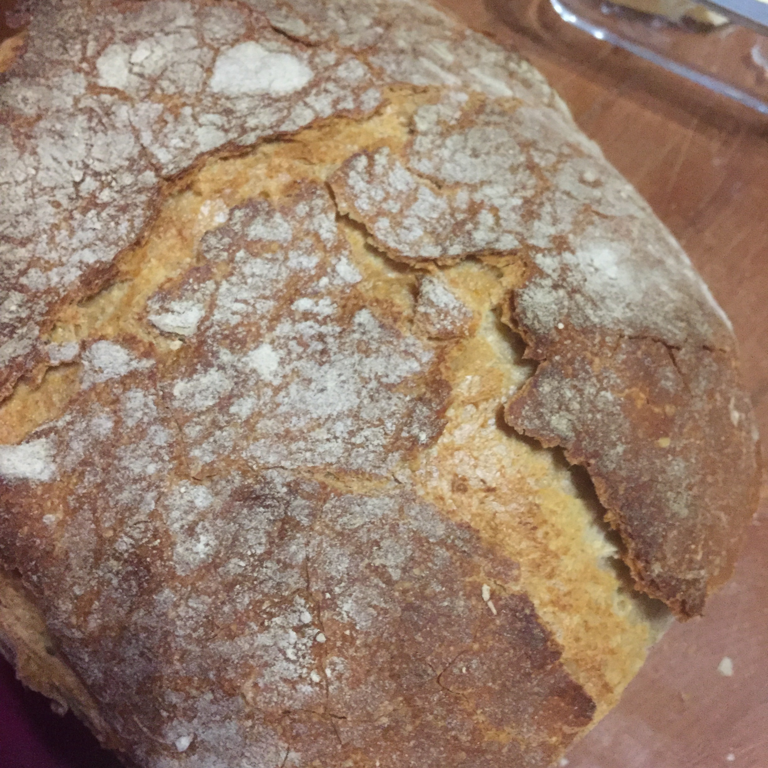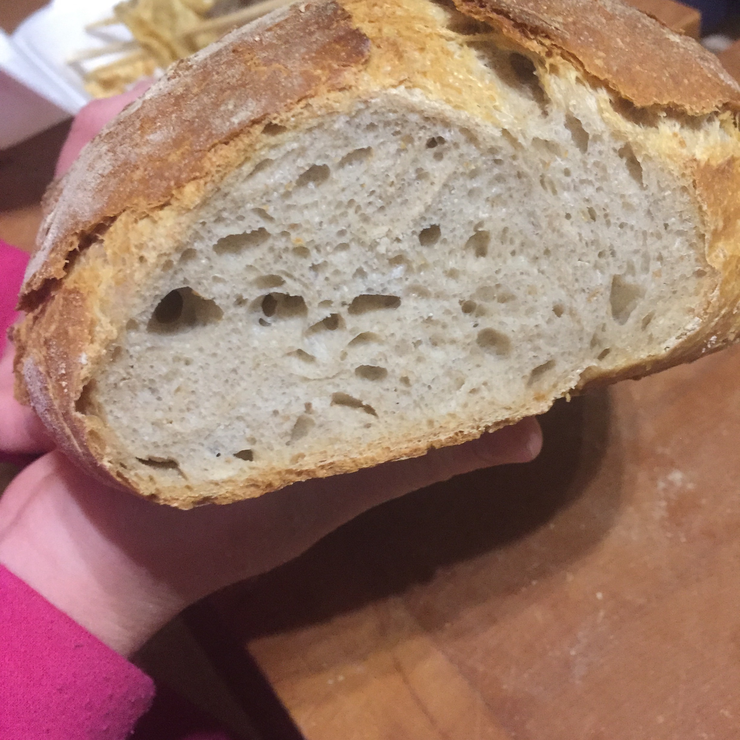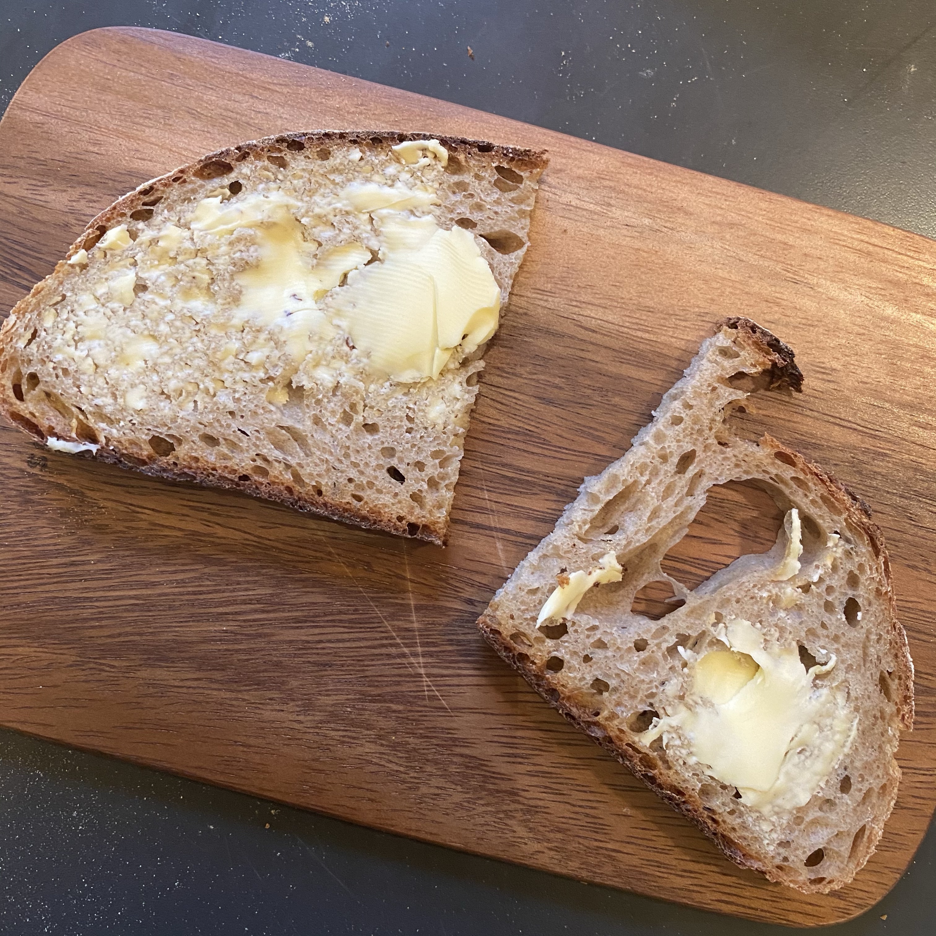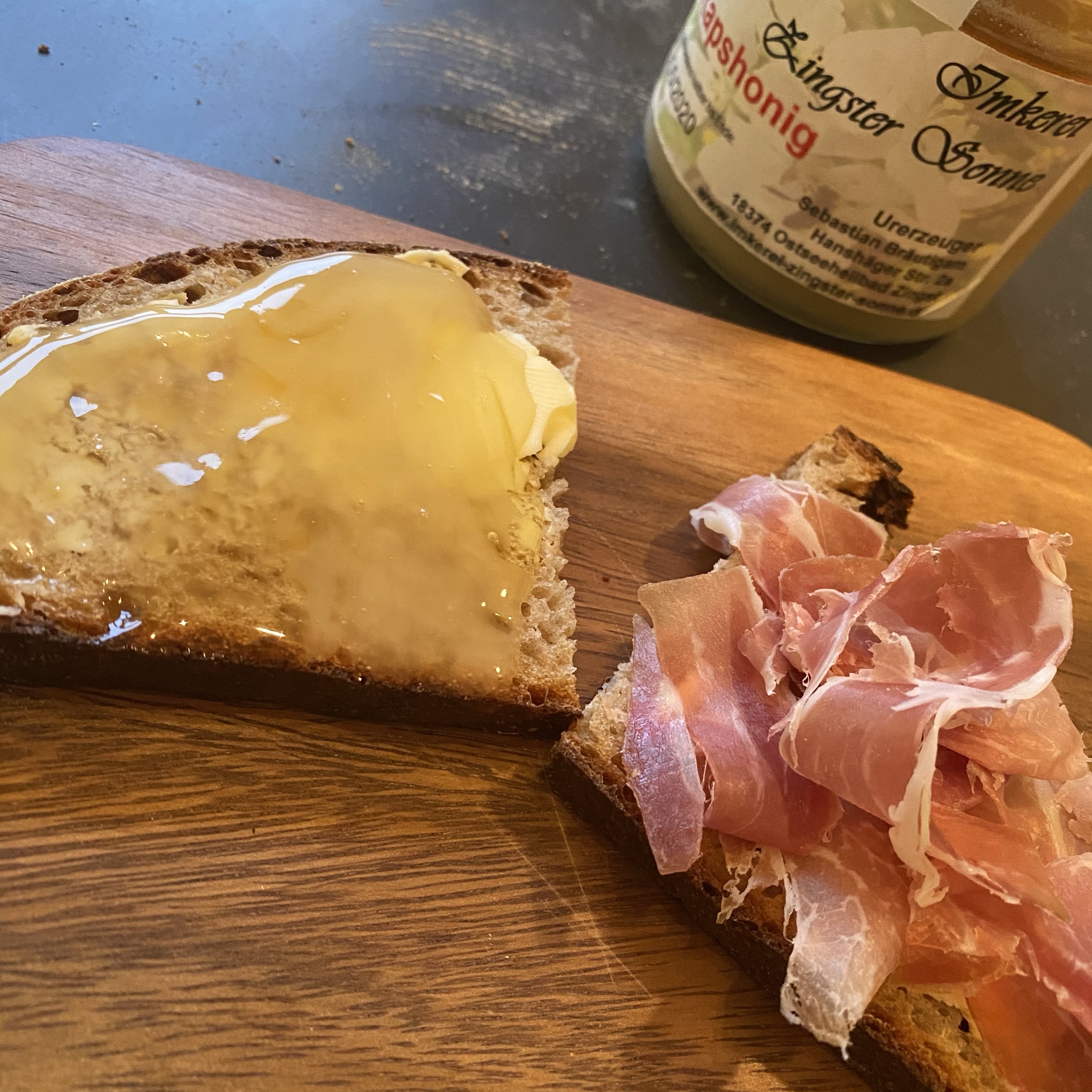 [kneteeis:] „Hihi, das Brot hat ja einen lustigen Krater da an der Seite! Eigentlich ganz praktisch: Ich nehme die Seite mit der dichten Krume für Honig und die andere für Parmaschinken…“