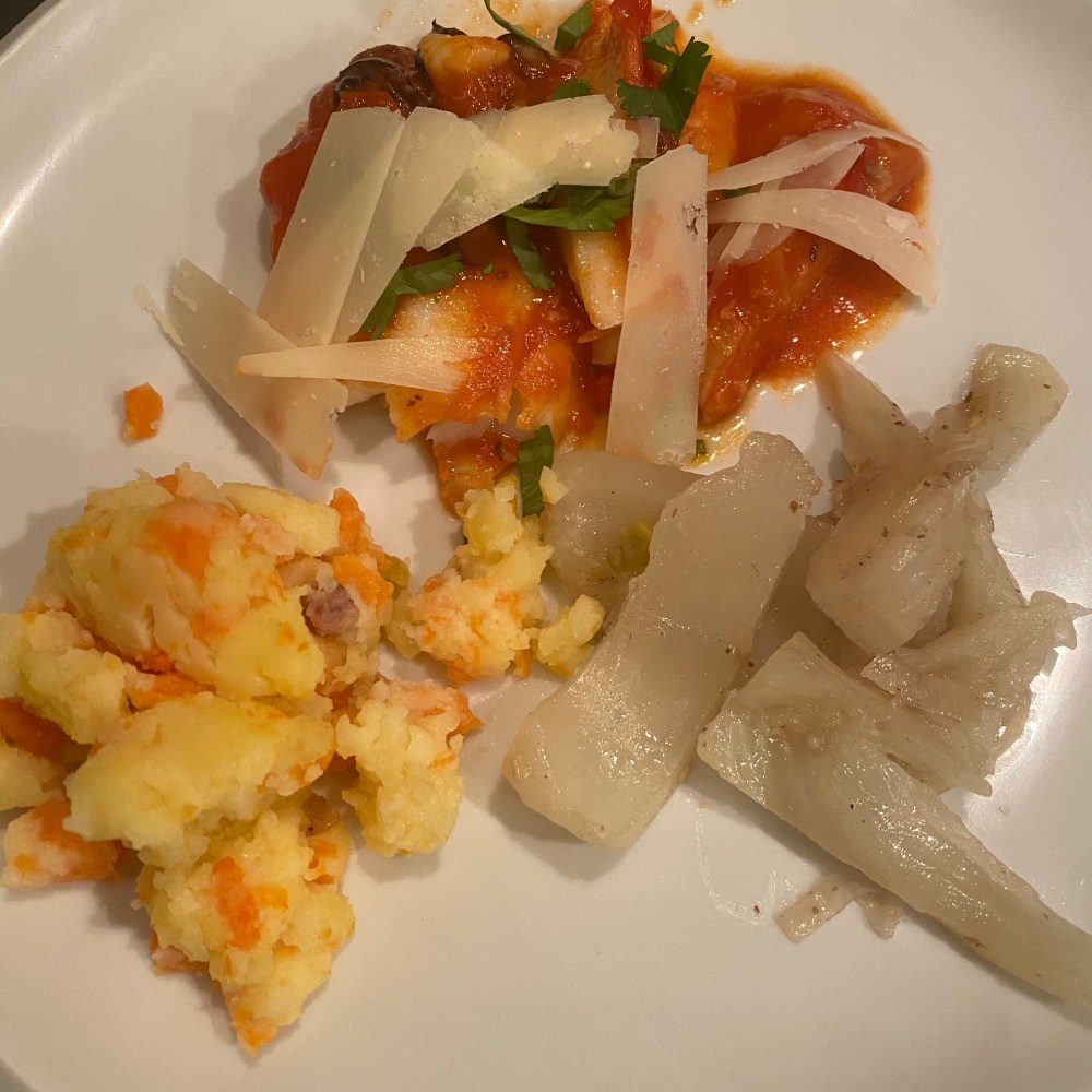 [kneteeis:] „Hm, dafür dass wir Fisch, Fenchel und Kartoffel-Möhren-Stampf essen wollten, hattest Du ziemlich viel Kartoffel-Möhren-Stampf und ziemlich wenig Fisch und Fenchel.“