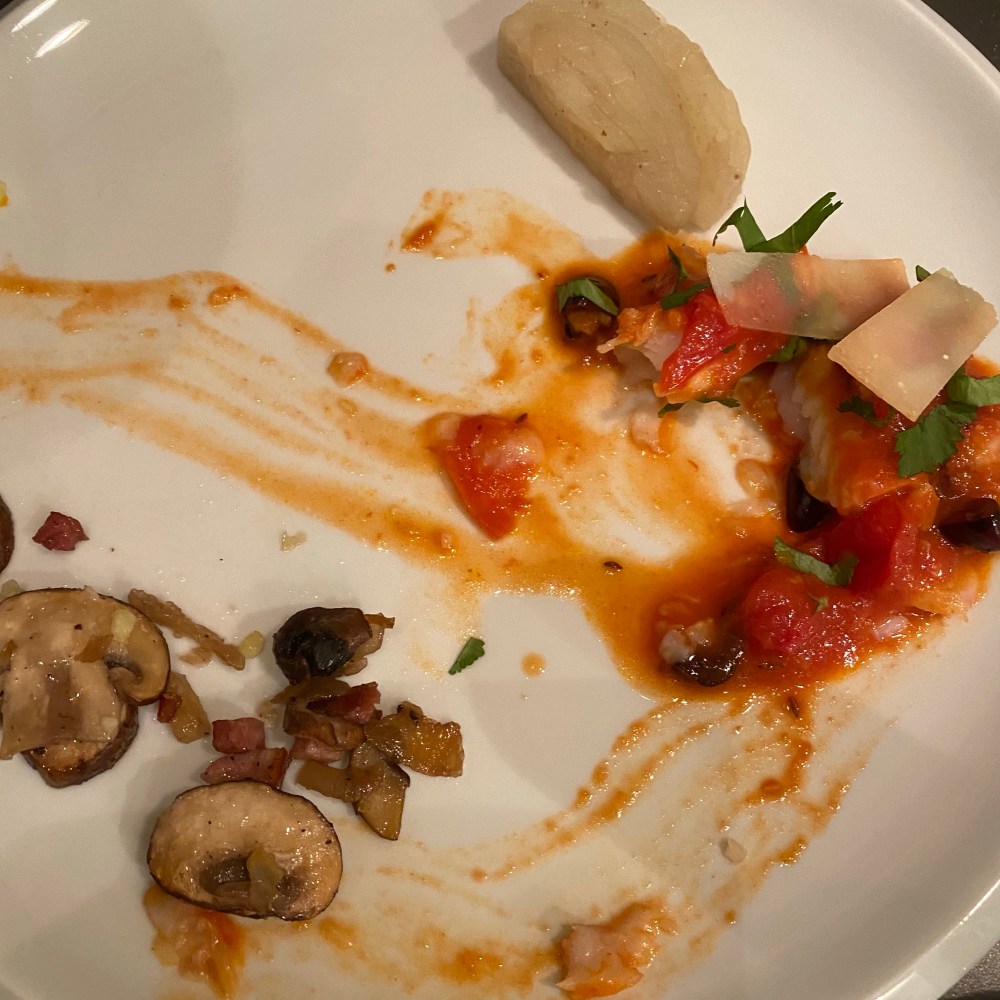 [GJ:] „Stimmt. Aber der Fisch schmeckt mir lecker. Nur der Kartoffel-Möhren-Stampf und die restlichen Pilze, die ich vorgestern selbst gekocht hatte, schmecken mir halt noch leckerer!“