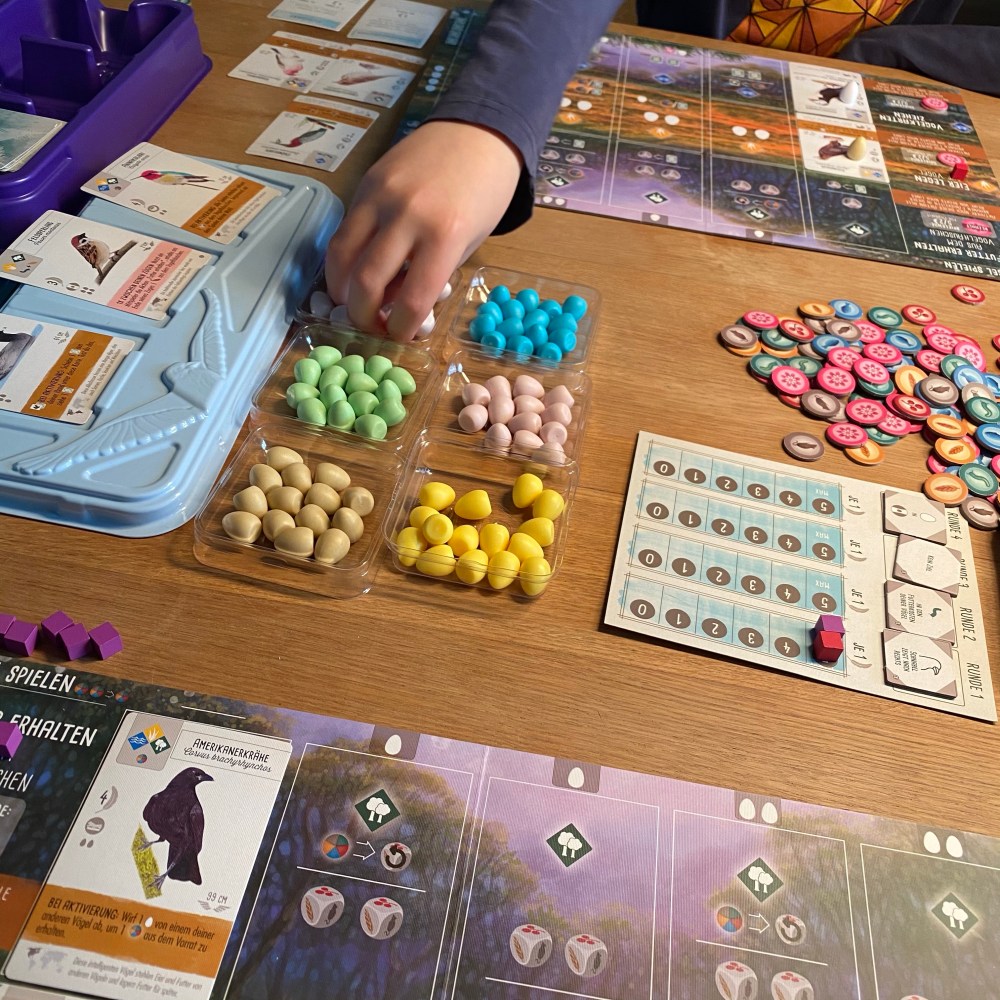 [Kurz darauf. GJ:] „Oh, guck mal, wie schön: Da sind neue Eier dabei, in Gelb! Und neues Futter! Und auch noch neue Spielertableaus! Wie hübsch!“