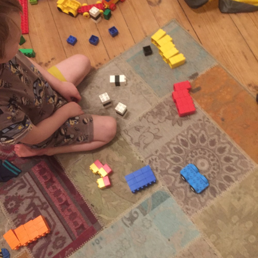 [KJ:] „Mama, ich räume, während ich spiele. Guck, ich habe alles sortiert. Fast. Die roten und die gelben und die blauen. Schwarz und weiß nur ein bisschen.“