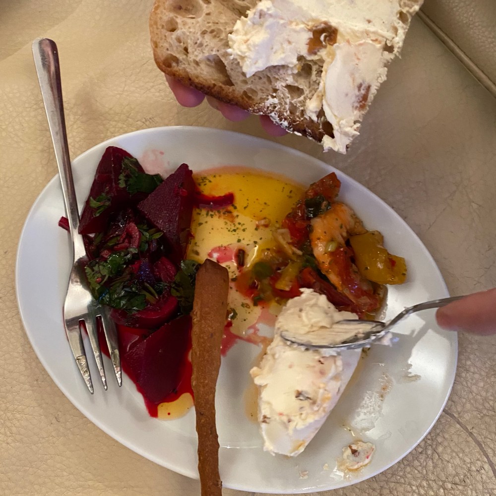 [kneteeis:] „Frischkäse, Rote Bete und Garnelensalat? Und lieber Grissini oder Brot?“