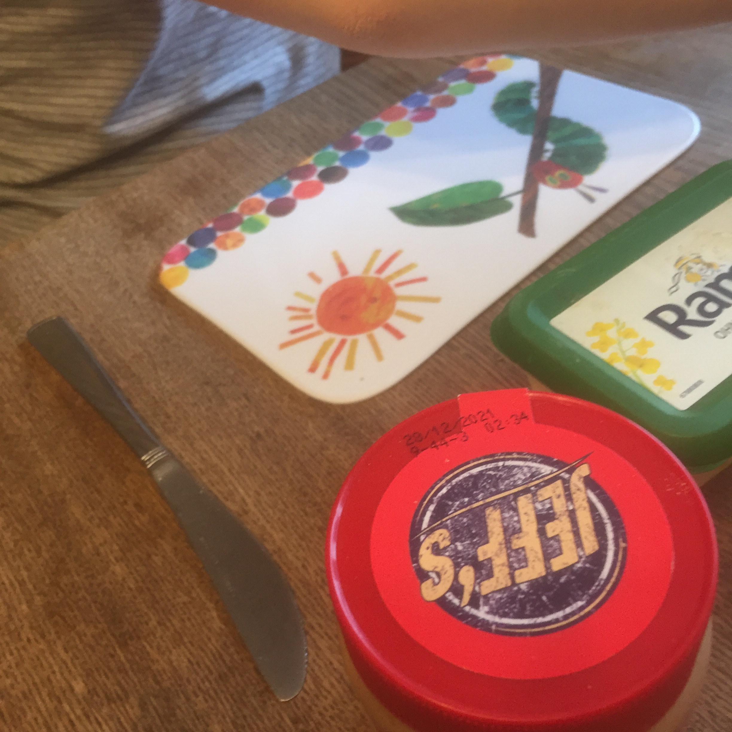 [folienstern:] „Papa und der kleine Junge haben jetzt mit Brot gedeckt. Dann machen wir jetzt normal, und morgen probiere ich die veganen Pfannkuchen.“