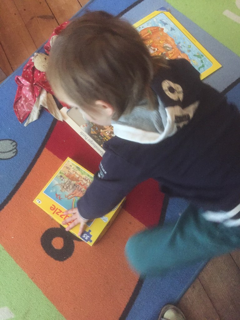 [KJ:] „Und jetzt machen wir die Arche-Noah-Puzzles. Erst wie sie einsteigen, dann wie sie fahren, und dann, wie sie aussteigen. Guck – die acht ist aussteigen, die sieben ist fahren und die sechs ist einsteigen. Oder ich mach doch lieber alle durcheinander!“