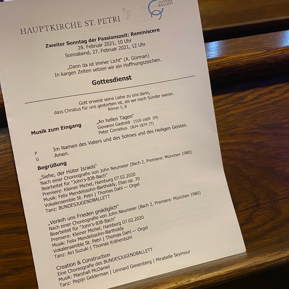 [Etwas später. kneteeis:] „Ach, war das großartig. Endlich mal wieder Live-Musik und Live-Ballett, und das noch so wunderbar als Teil des Gottesdienstes, sogar mit Tanz bei der Predigt. Und die war so schön und hoffnungsvoll mit dem tollen Zitat von Amanda Gorman am Ende: ‚For there is always light, if only we’re brave enough to see it. If only we’re brave enough to be it‘.“