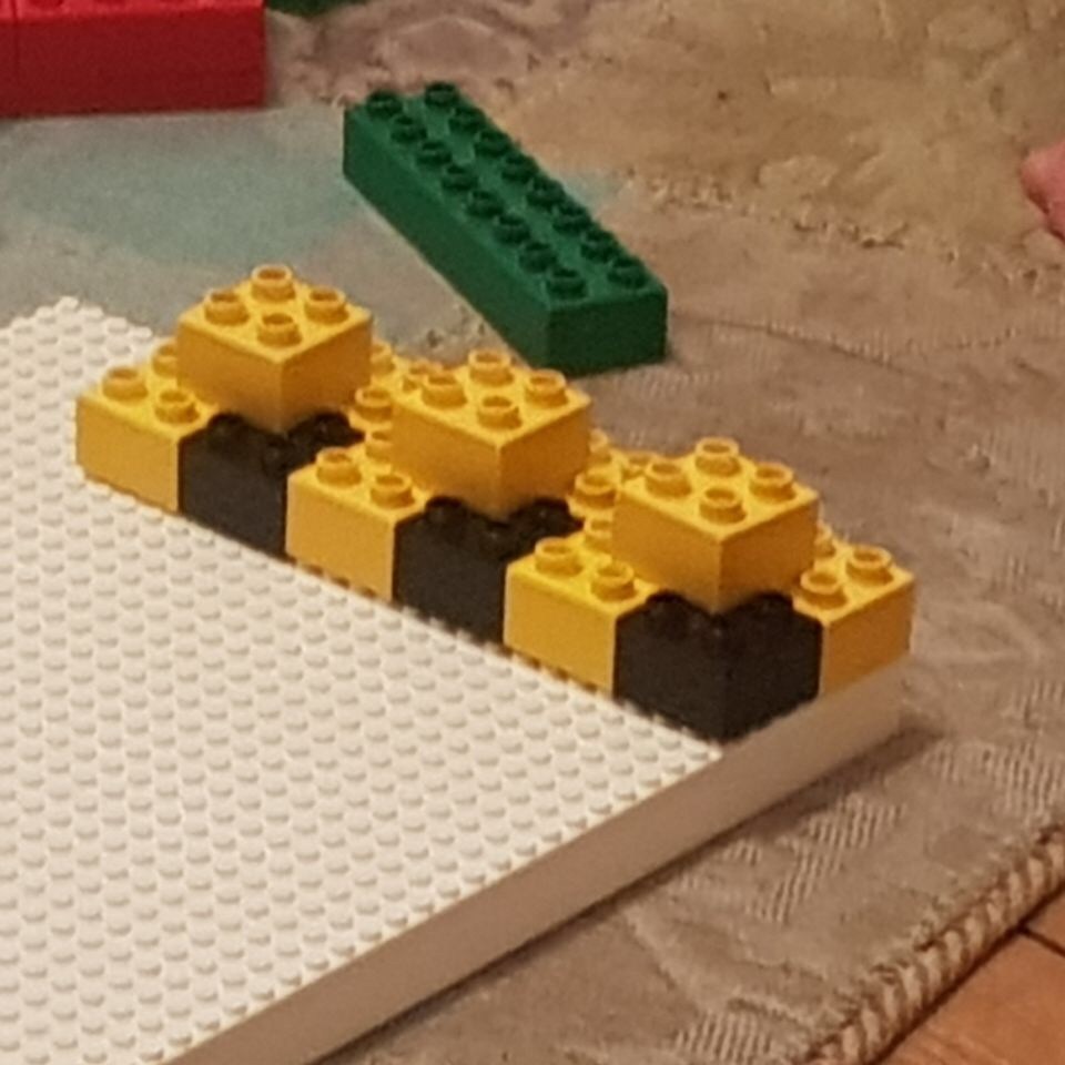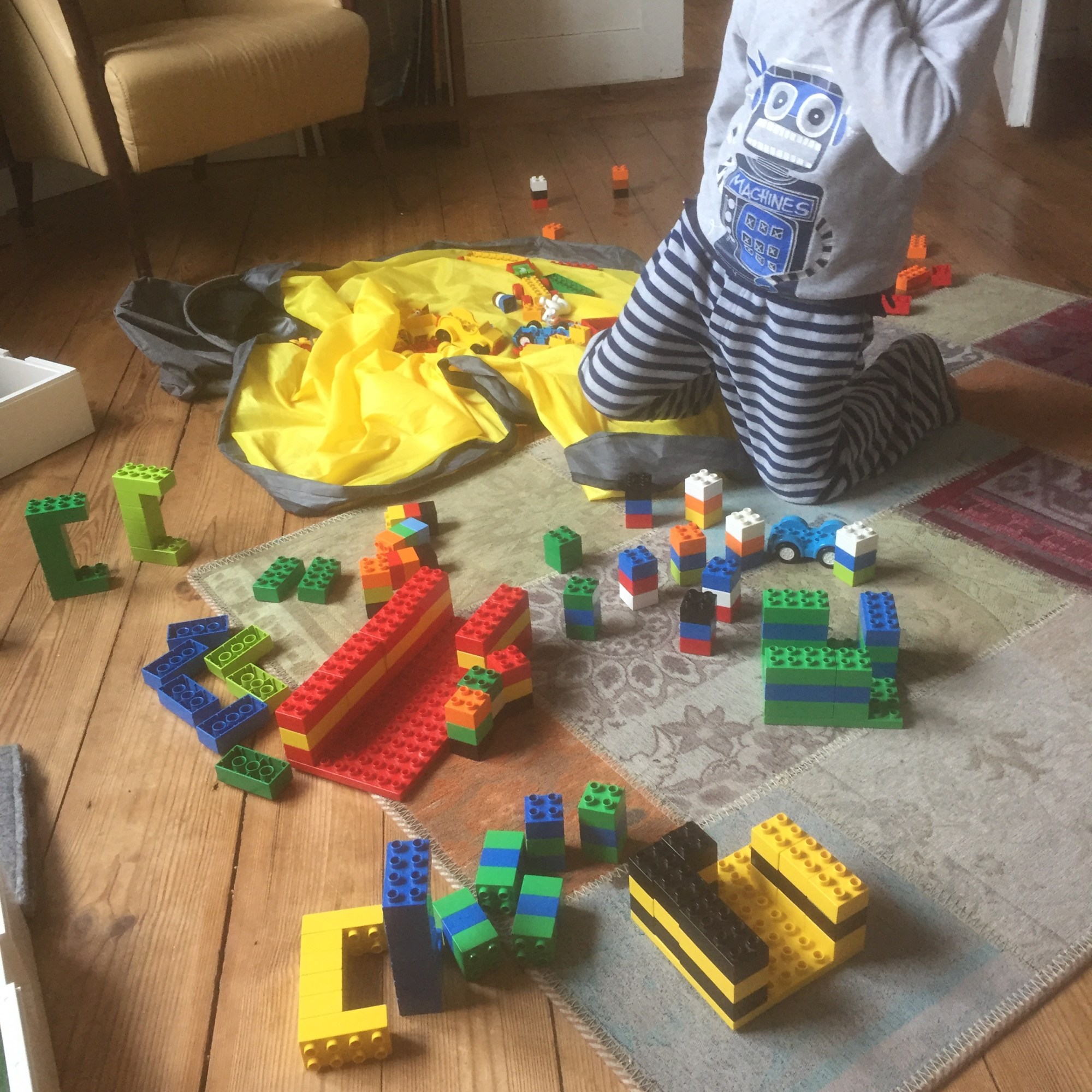 [KJ:] „Erst spiele ich. Dann baue ich. Guck, das sind Klone! Ganz viele. Und dann räume ich auf. Dürfen die Klone stehenbleiben? Guck, das ist ein Bienenkuchen. Schwarz und Gelb.“