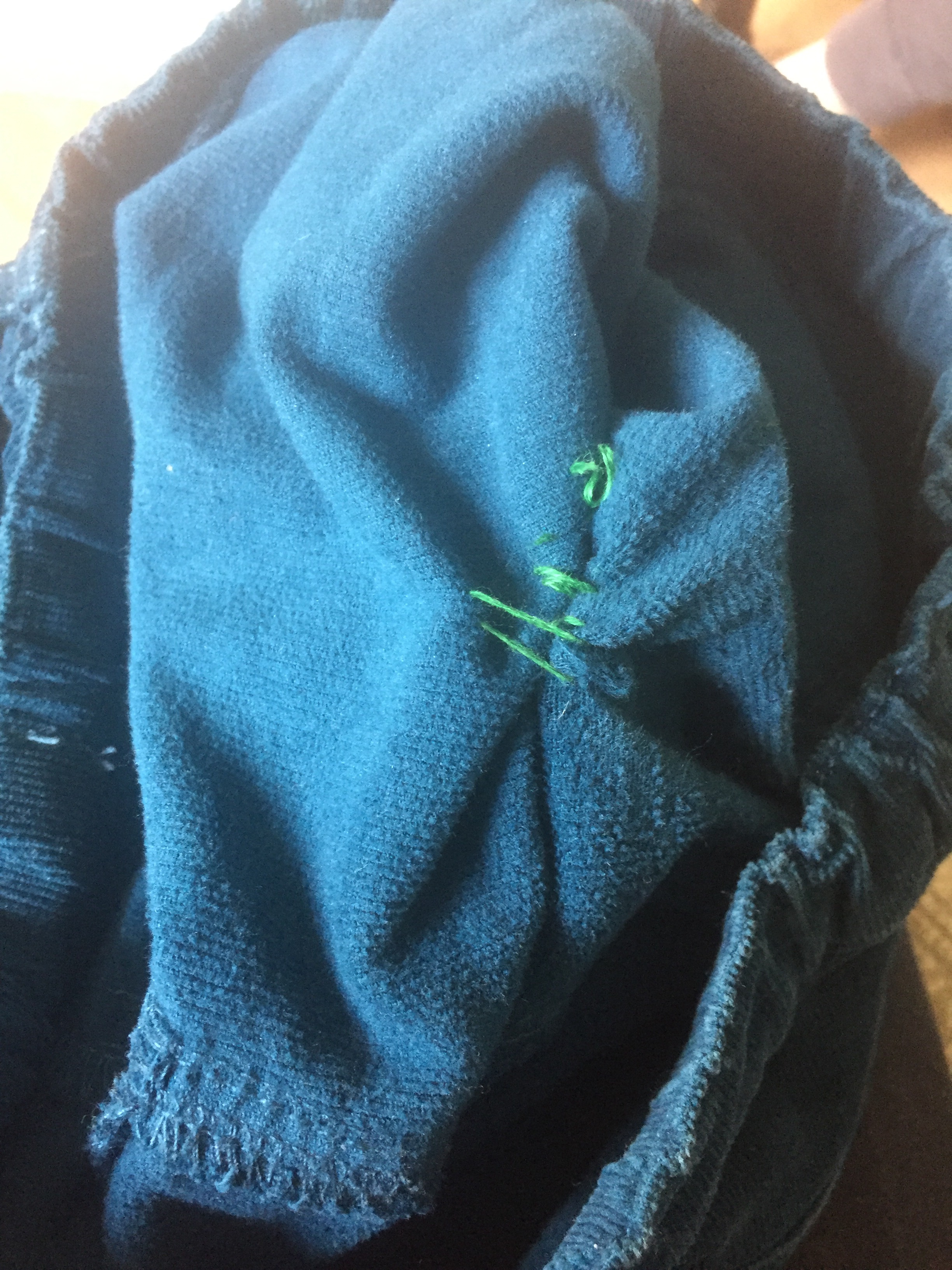 [KM:] „Mama, guck mal, ich hab schon meine Hose genäht heute morgen! Der Faden guckt zwar auf der anderen Seite raus, aber das macht ja nichts.“
