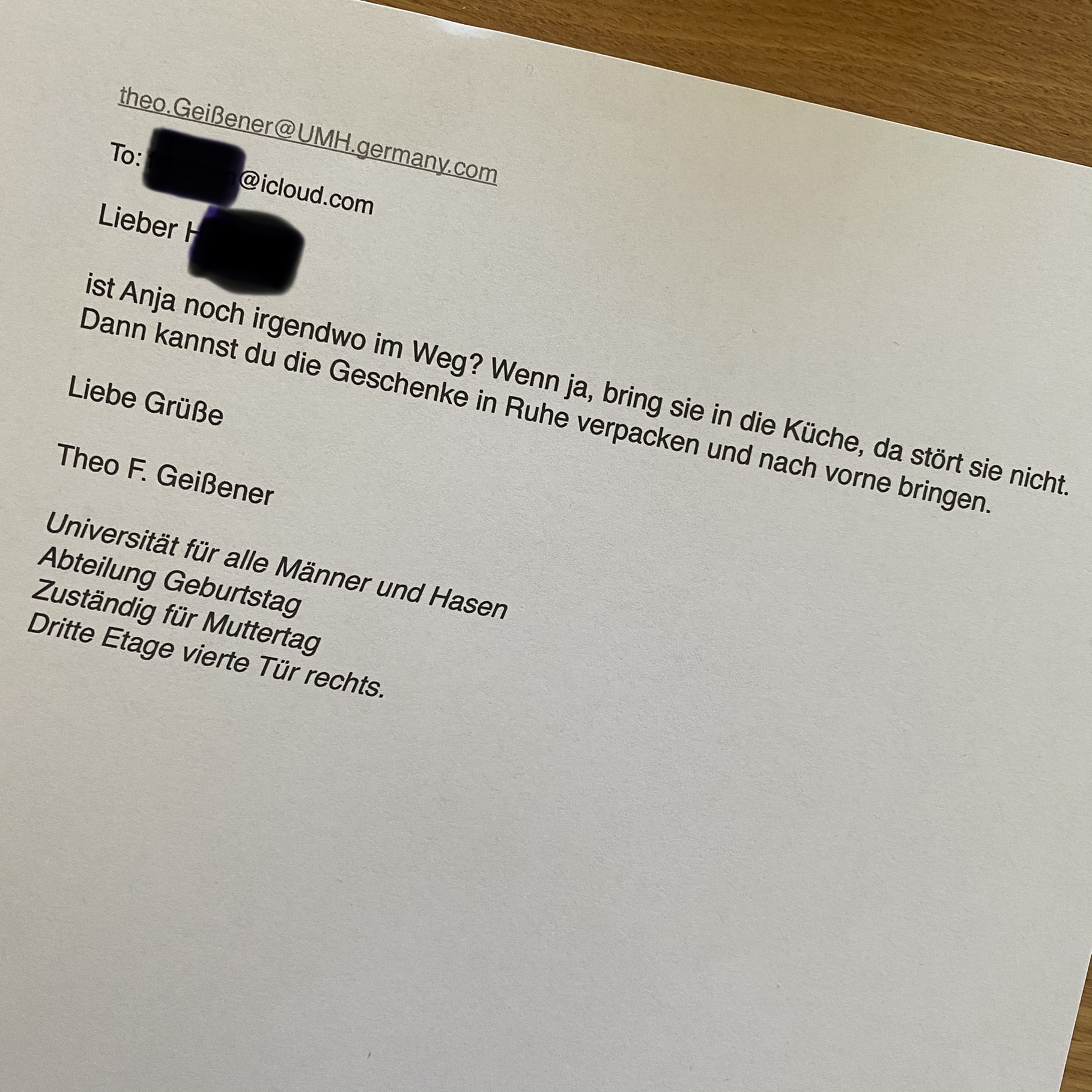 [kneteeis:] „Oh, ein richtiger Muttertagstisch mit meiner alten Puppe und meinem alten Teddy! Und Post von Dir – wie toll! Und was ist der andere Zettel?“