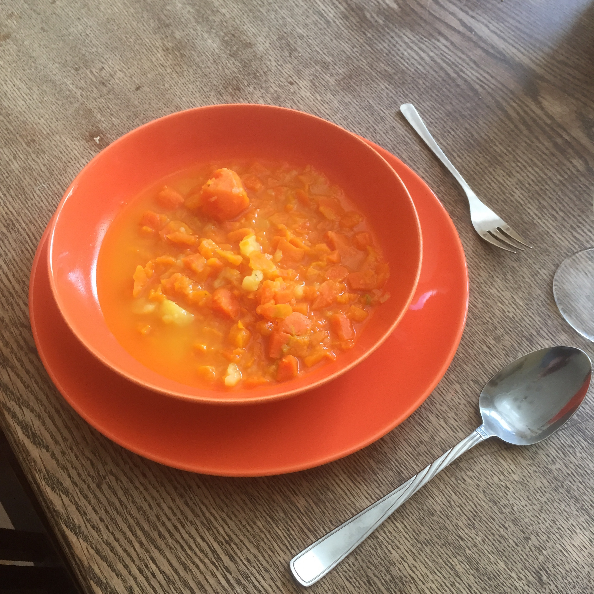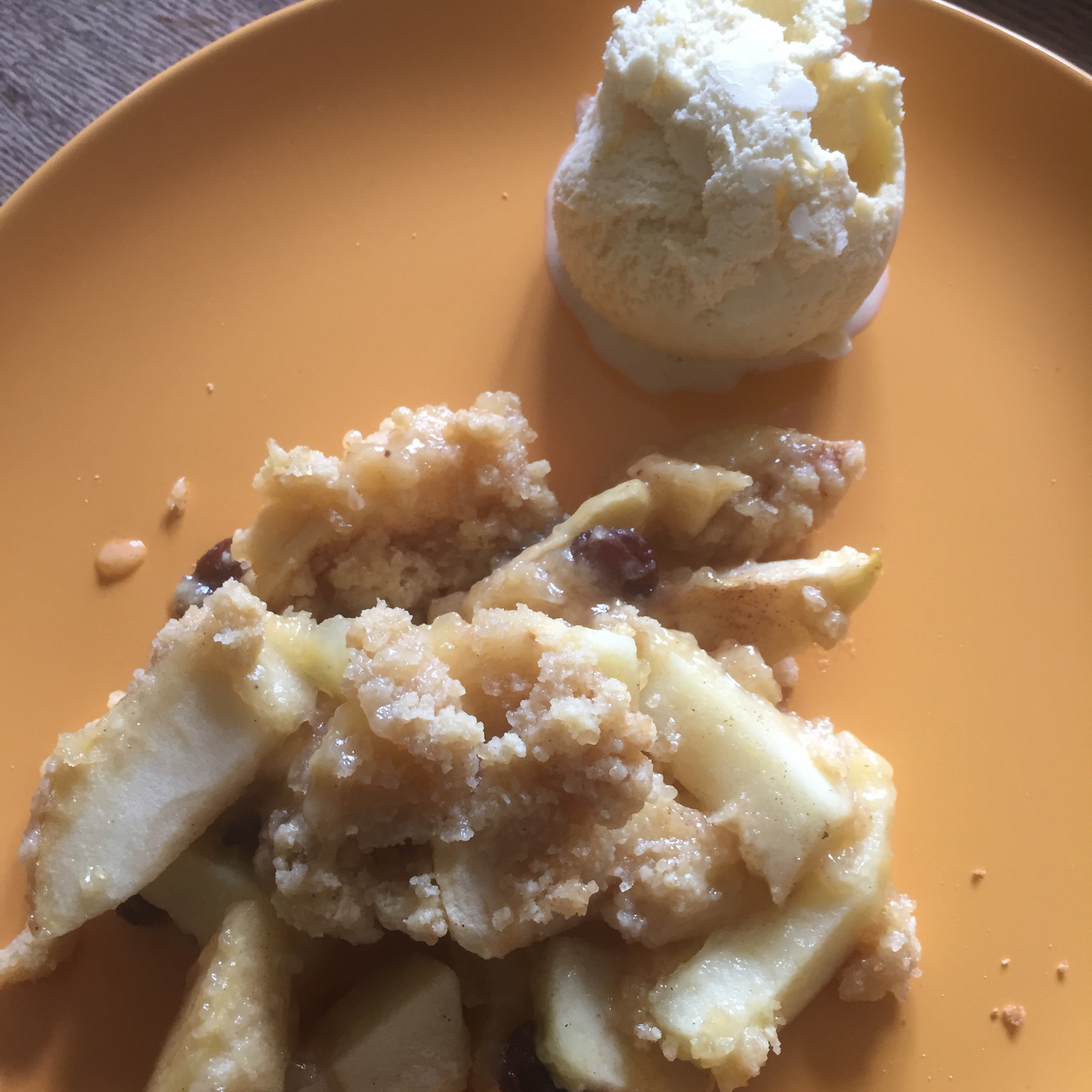[folienstern:] „Möhrensuppe und zum Nachtisch Apple Crumble und Eis.“
