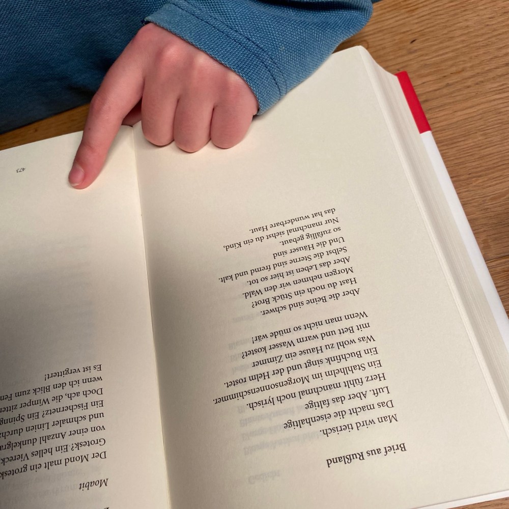 [GJ:] “Weil man es lesen kann, wie einen Text, so dass man nicht merkt, dass es ein Gedicht ist. Aber durch die Reime merkt man das dann doch, und eigentlich ist jeder Reim dann ein Widerspruch.”
