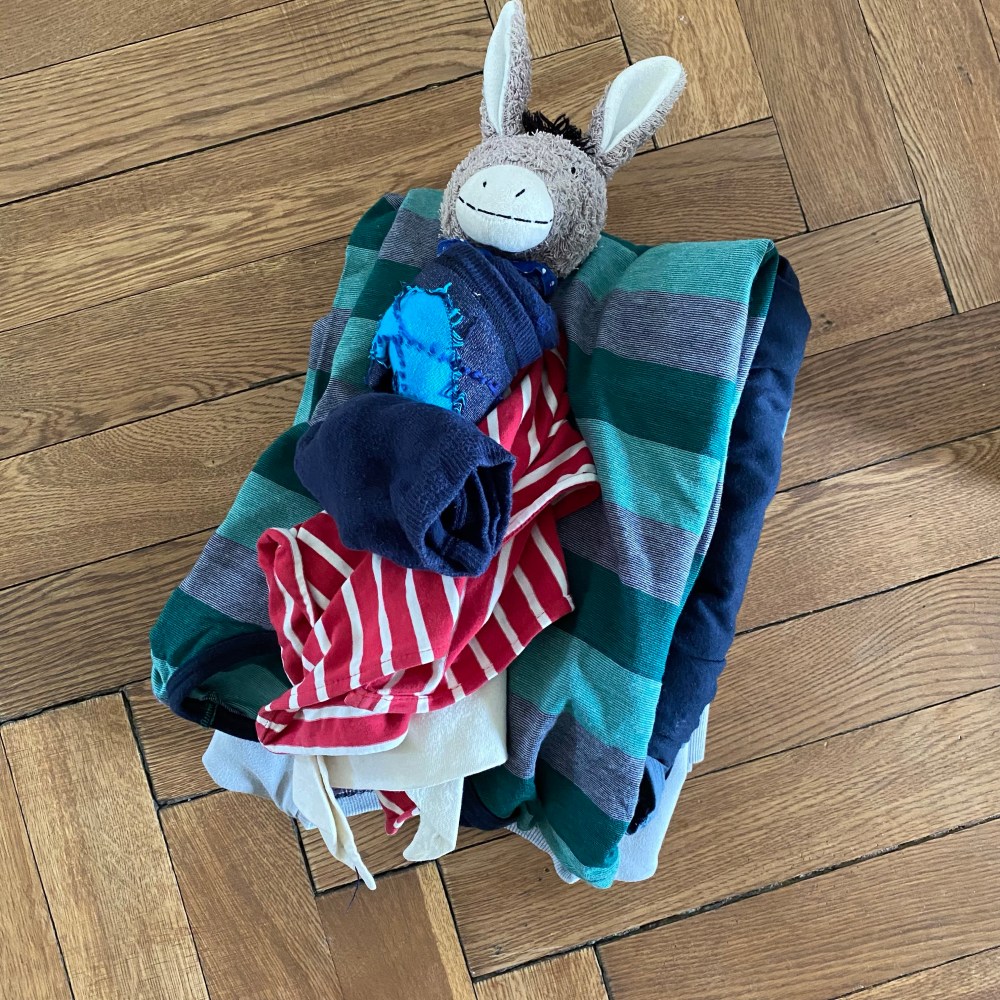 [GJ:] „Ich denke schon. Hier ist der Stapel! Nur die kurze Hose habe ich weggelassen. Papa meinte, ich sollte eine mitnehmen, aber ich glaube, bei dem Wetter brauche ich die nicht. Außerdem trage ich sowieso eigentlich nie kurze Hosen.“