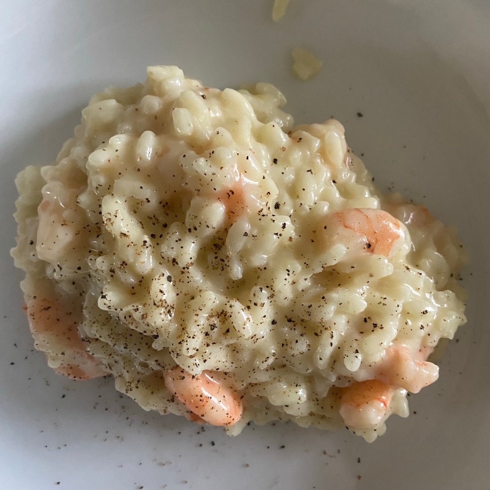 [kneteeis:] „Jetzt mache ich noch Risotto mit Garnelen. Wie gut, dass der große Junge nicht da ist, der mag ja nicht so gerne Risotto.“